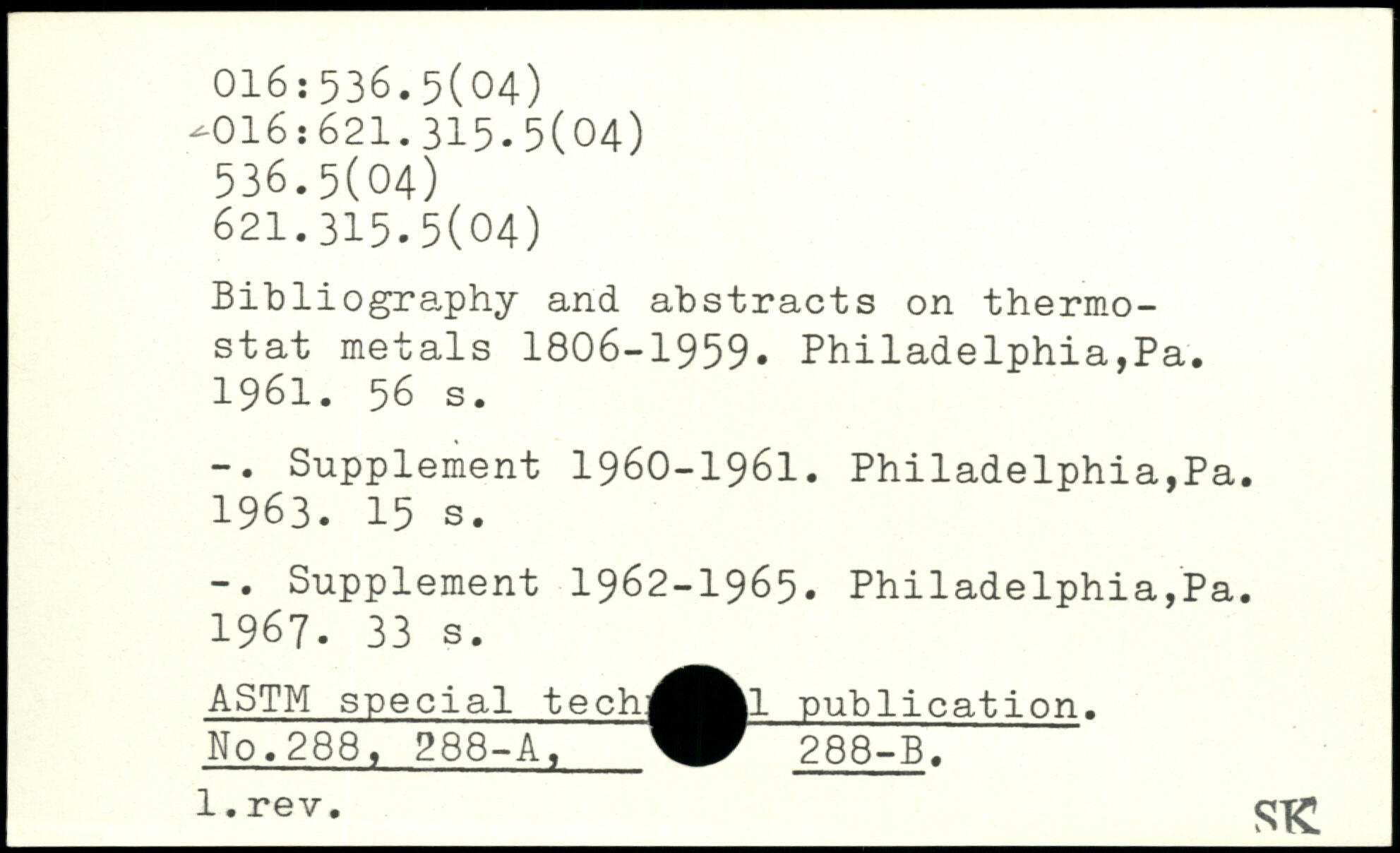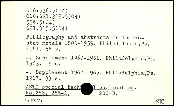 Bibliography and abstracts on thermostat metals 1806-1959. Philadelphia,Pa. 1961.