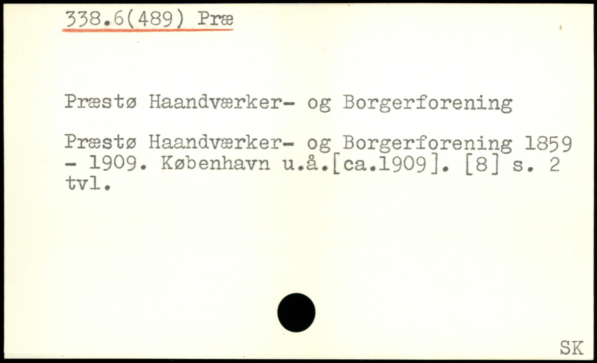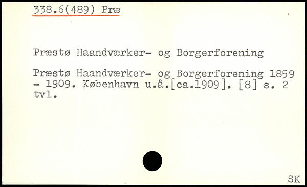 Præstø Haandværker- og Borgerforening Præstø Haandværker- og Borgerforening 1859 - 1909. København u.å.[ca.1909]. [8] s. 2 tvl.