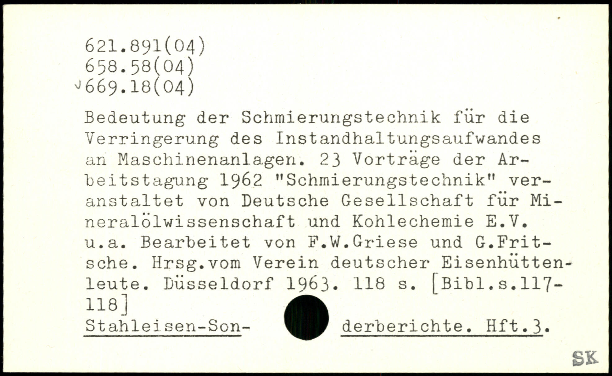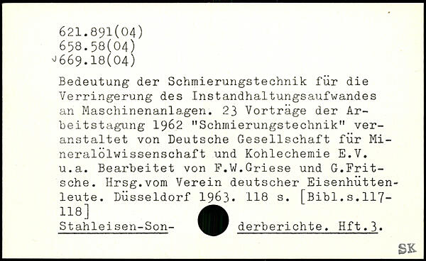 Bedeutung der Schmierungstechnik für die Verringerung des Instandhaltungsaufwandes an Maschinenanla.gen. 23 Vorträge der Arbeitstagung 1962 MSchInierungstechnik,, veranstaltet von Deutsche Gesellschaft für Mineralölwissenschaft und Kohlechemie E.V. u.a. Bearbeitet von F.W.Griese und G.Frit-sche. Hrsg.vom Verein deutscher Eisenhüttenleute. Düsseldorf 1963
