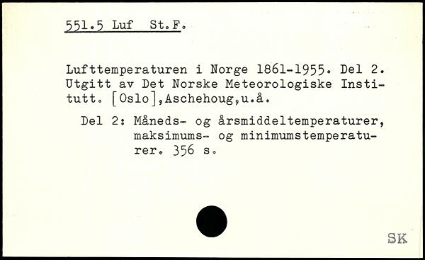 Lufttemperaturen i Norge 1861-1955, Del 2. Utgitt av Det Norske Meteorologiske Institutto [Oslo],Aschehoug,u.å. Del 2: Måneds- og årsmiddeltemperaturer, maksimums- og minimumstemperaturer