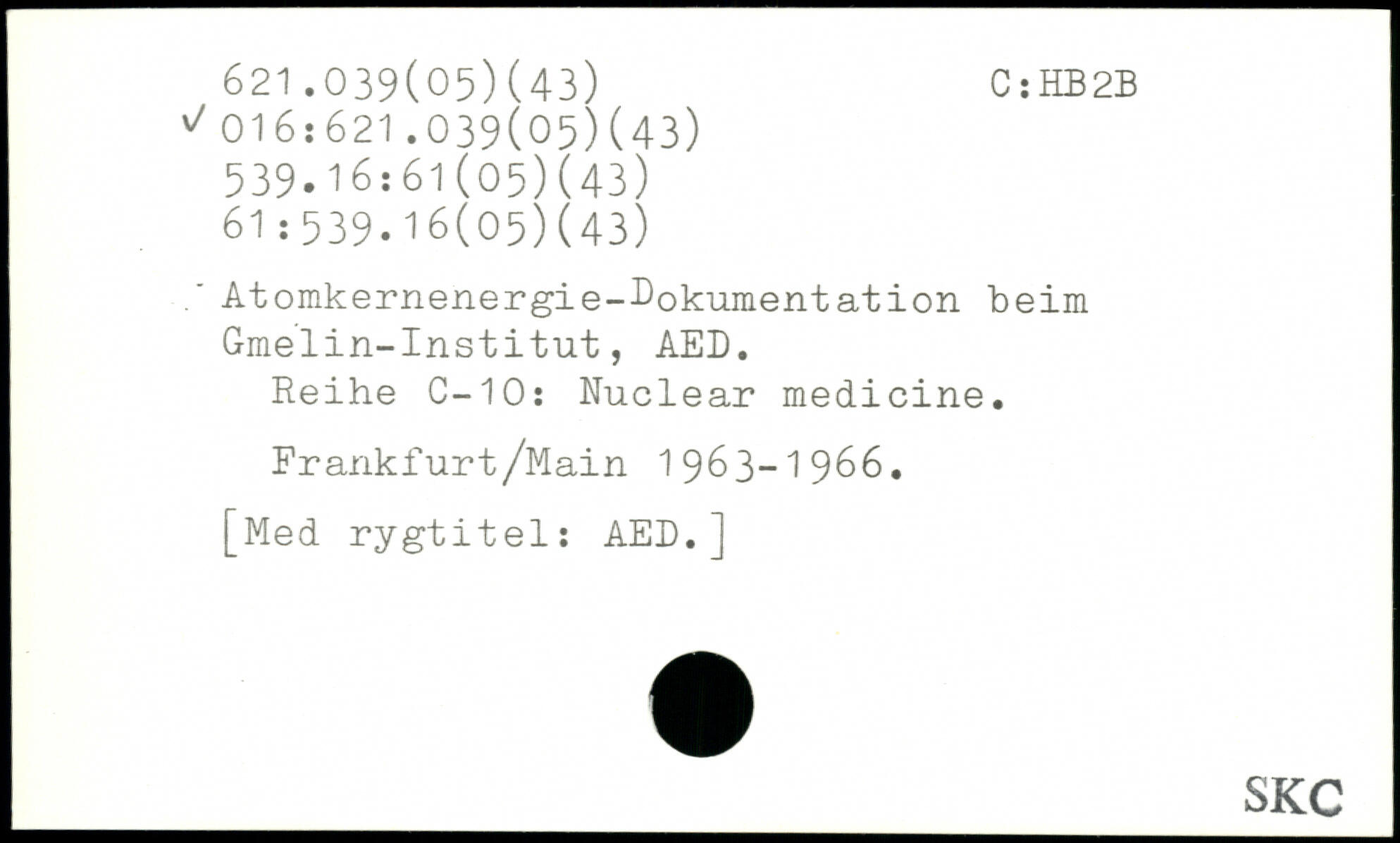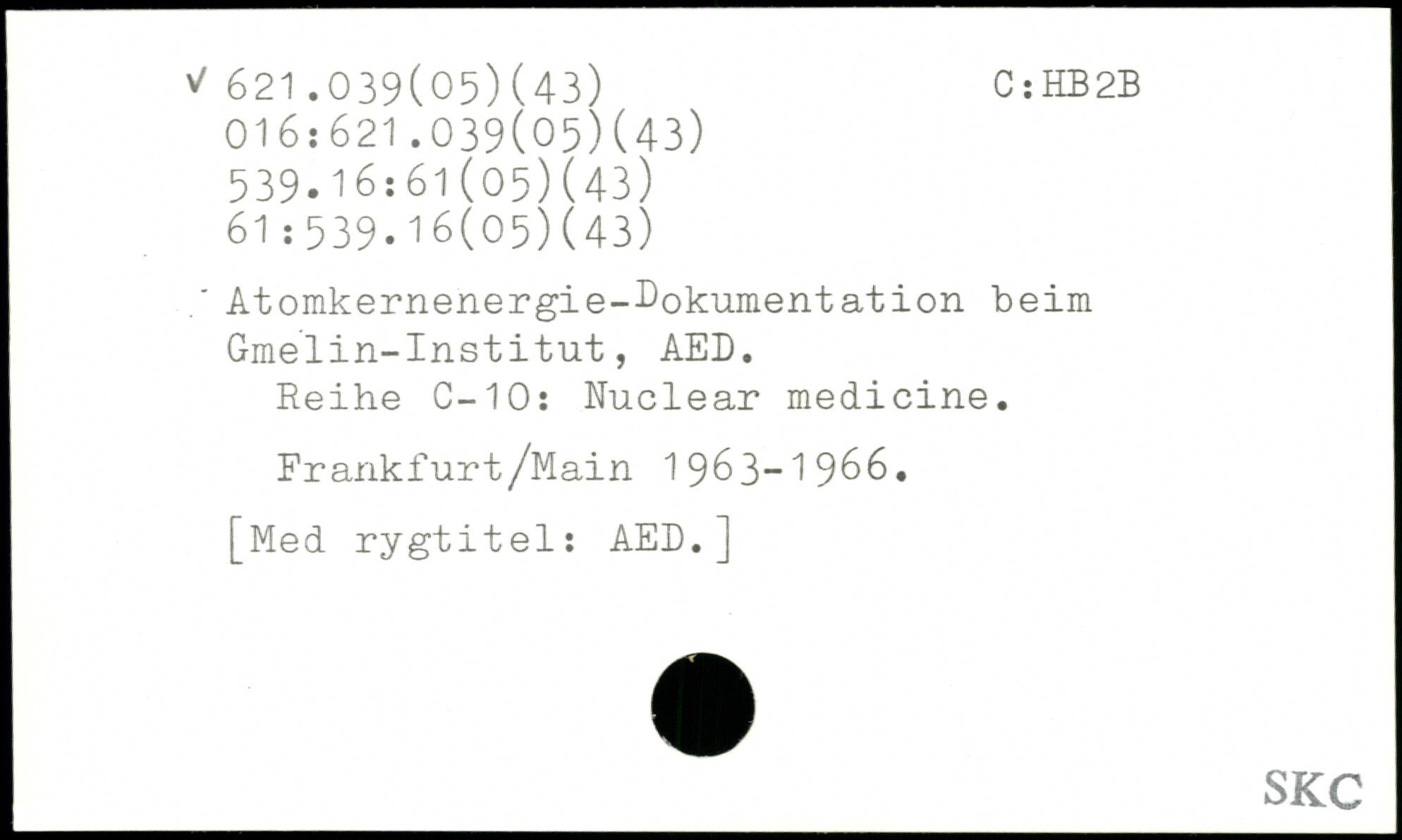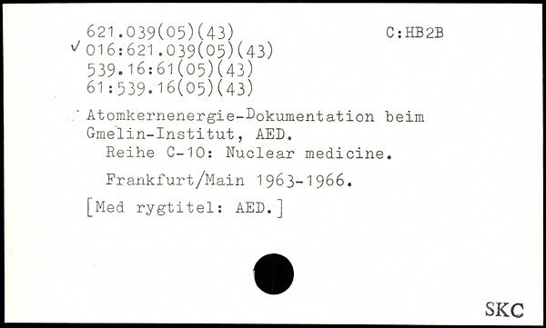 Atomkernenergie-Dokumentation beim Gmelin-Institut, AED. Reihe C-10: Nuclear medicine. Frankfurt/Main 1963-1966.