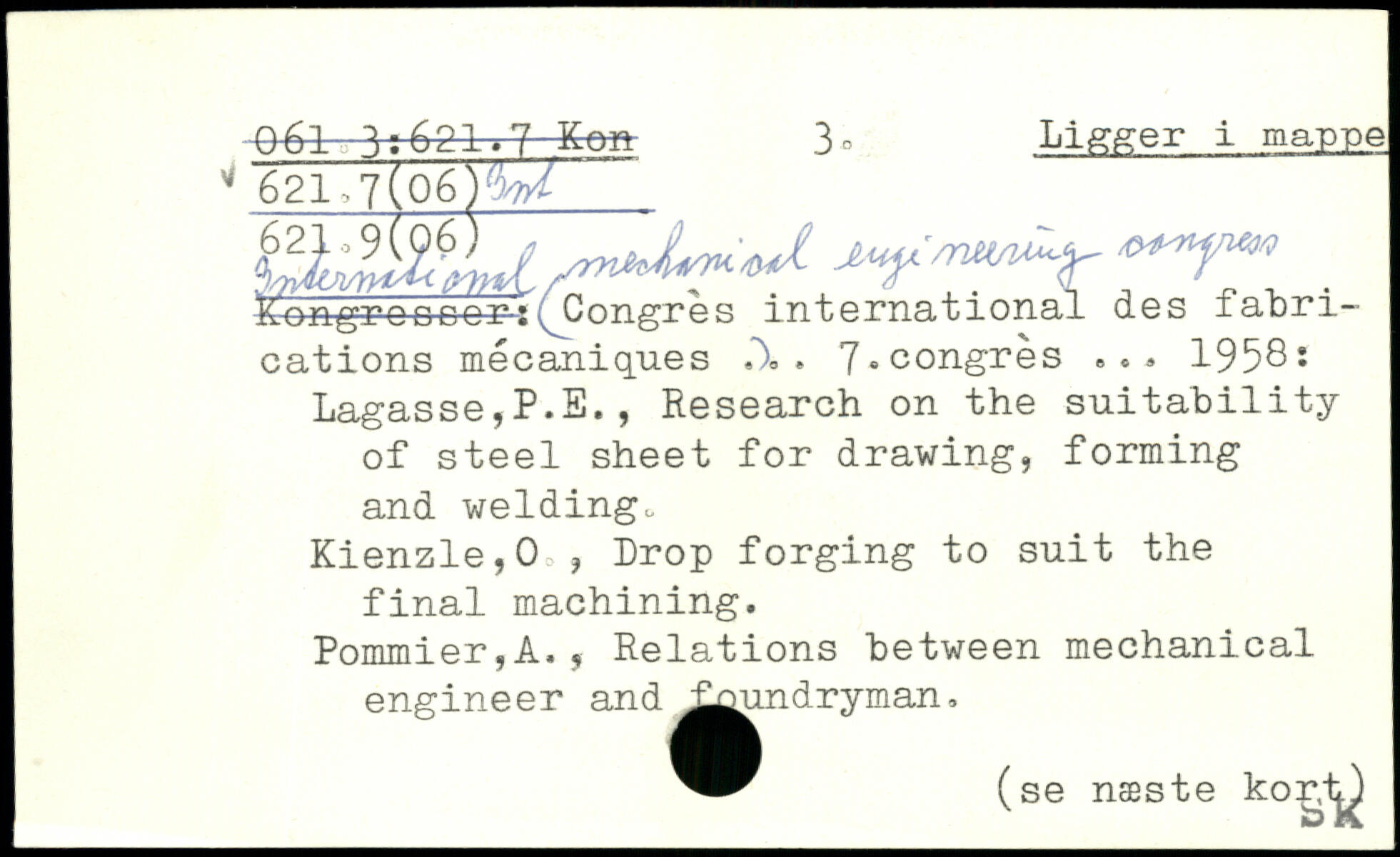 hongre eser-:^Congres international des 1 abri-cations mécaniques A. 7.congrès ,., 1958: Lagasse,P.E., Research on the suitability of steel sheet for drawing, forming and weldingc Kienzle,0:, Drop forging to suit the final machining. Pommier,A., Relations between mechanical engineer and ^^undryman,