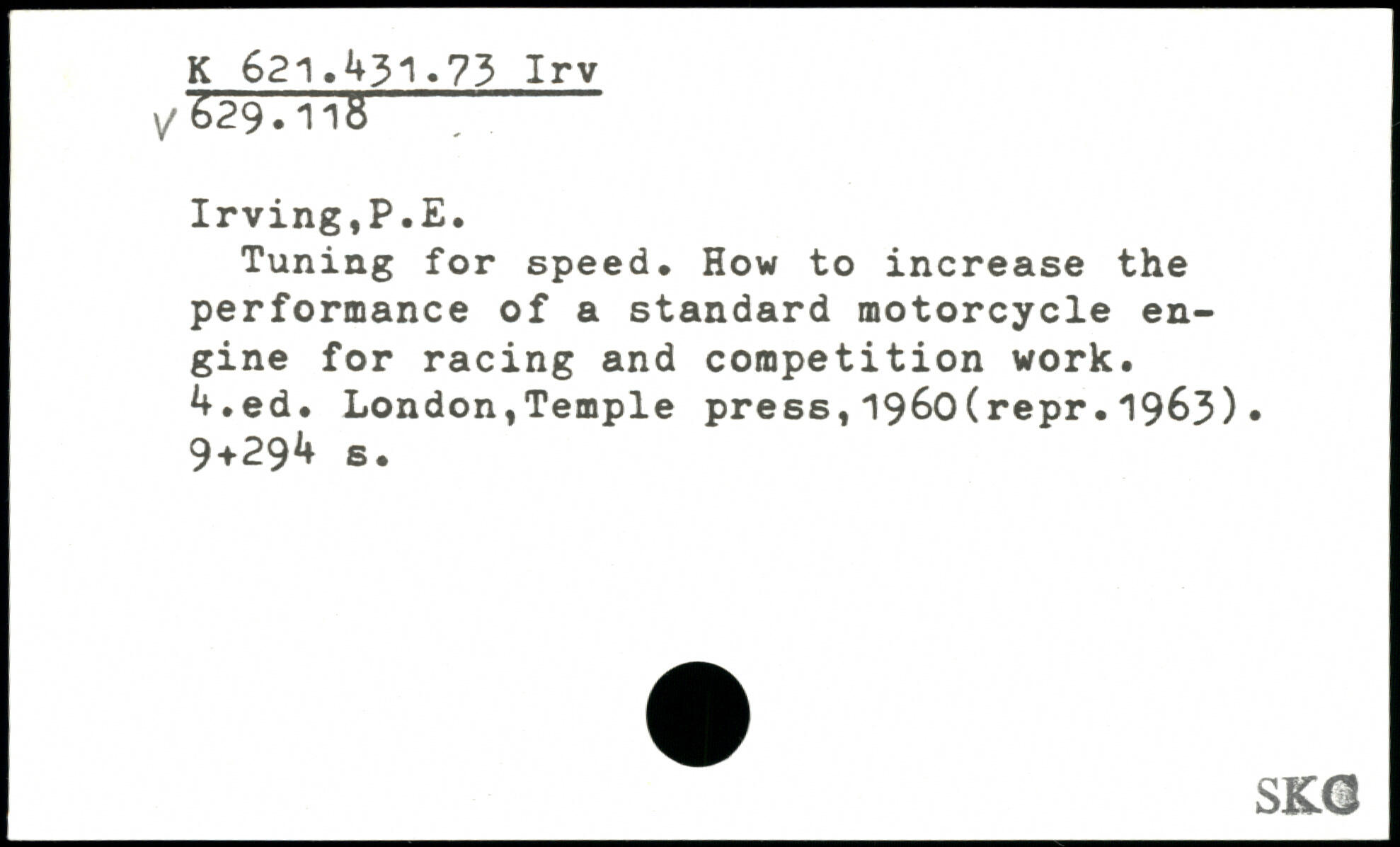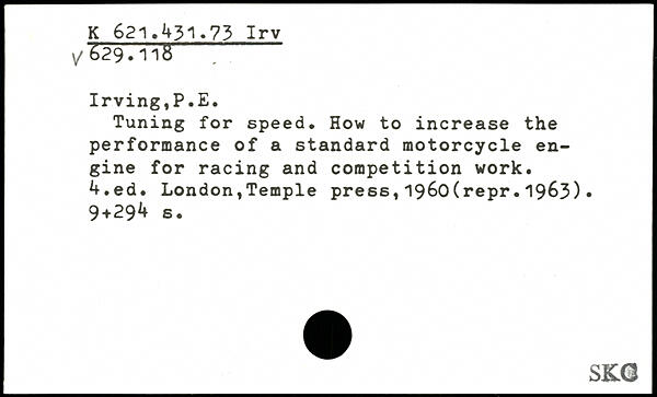 Tuning for speed. How to increase the performance of a standard motorcycle engine for racing and competition work. ...ed. London,Temple press, T9&0(repr. 19&3). 9+29^ s.