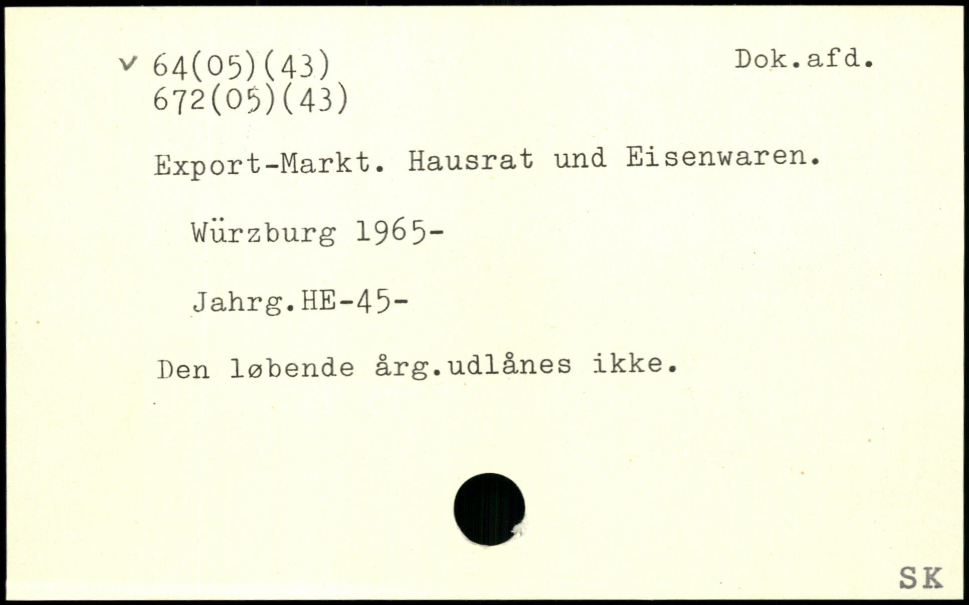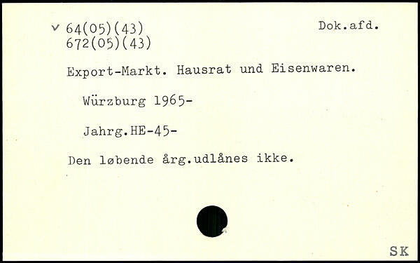 Export-Markt. Hausrat und Eisenwaren. Wurzburg 1965" Jahrg.HE-45- Den løbende årg.udlånes ikke.