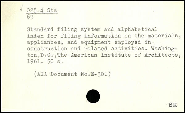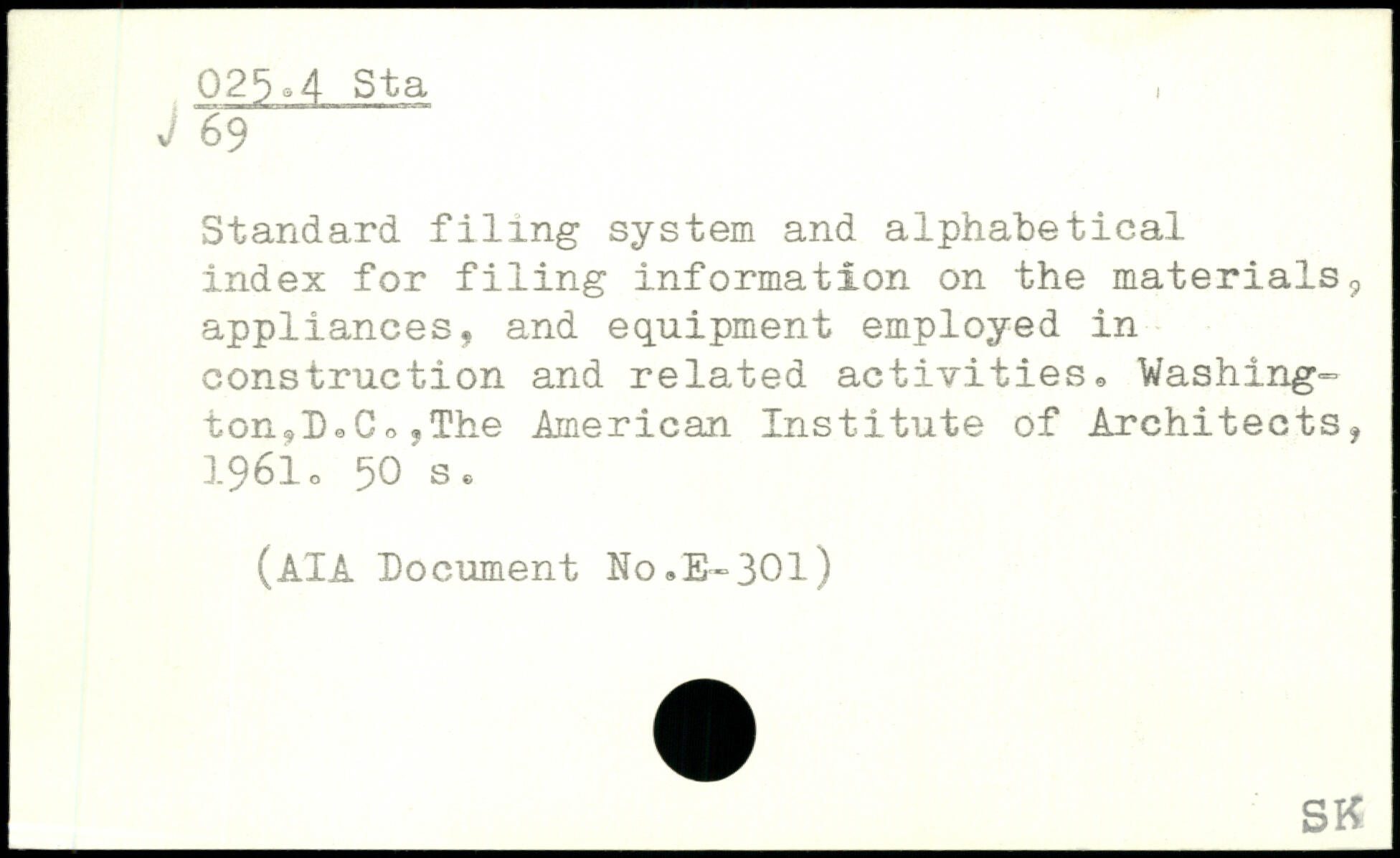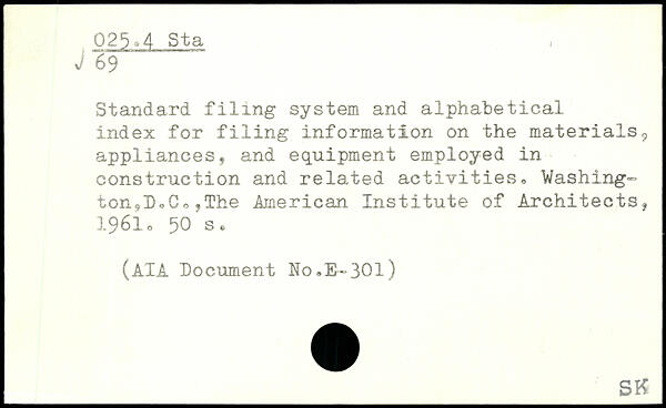 Standard filing system and alphabetical index for filing information on the materials9 appliances, and equipment employed in construction and related activities,, Washington,D,Co,The American Institute of Architects. 1961o