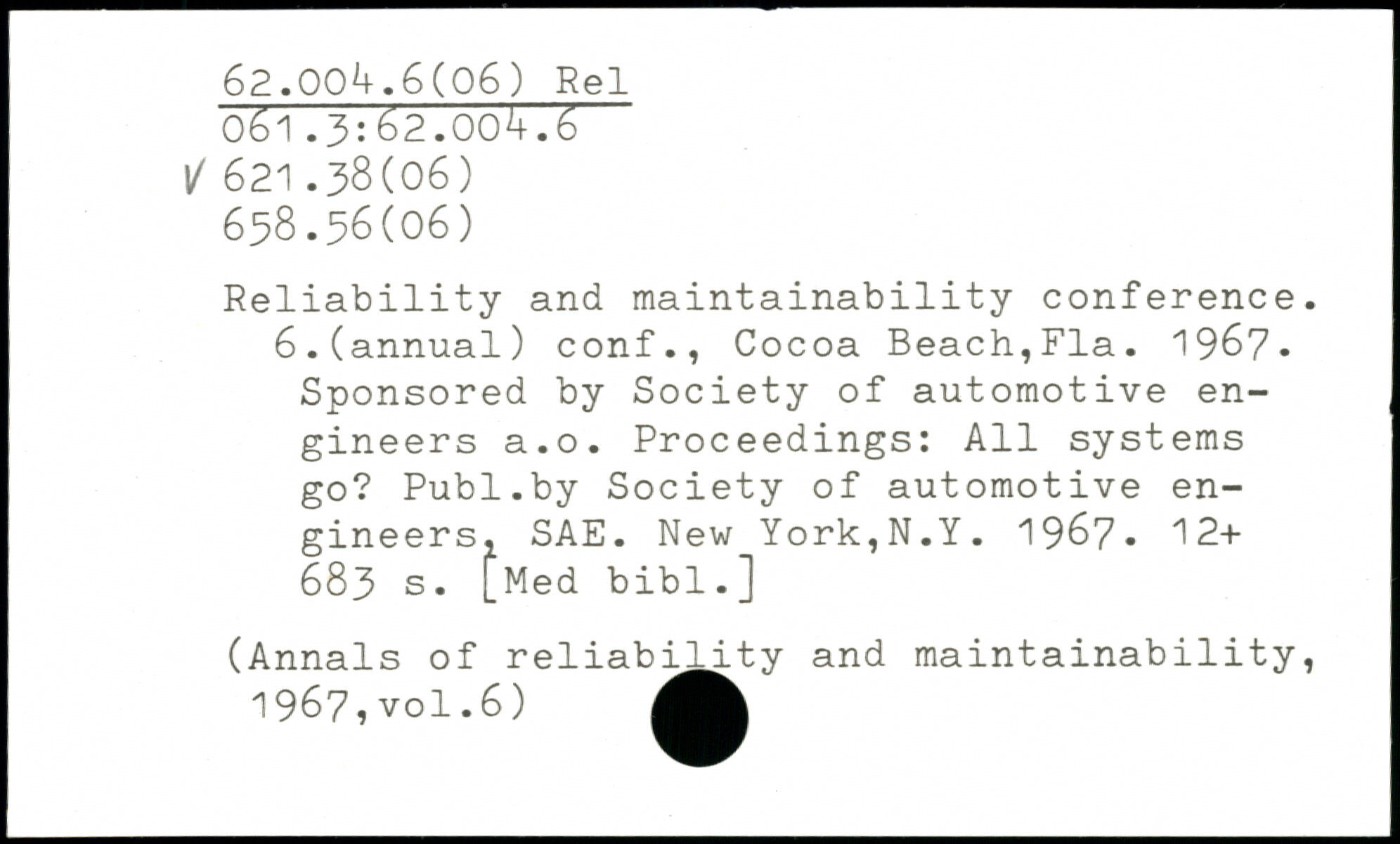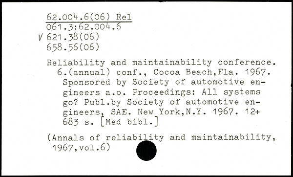 Reliability and maintainability conference. 6.(annual) conf., Cocoa Beach,Fla. 196?. Sponsored by Society of automotive engineers a.o. Proceedings: All systems go?