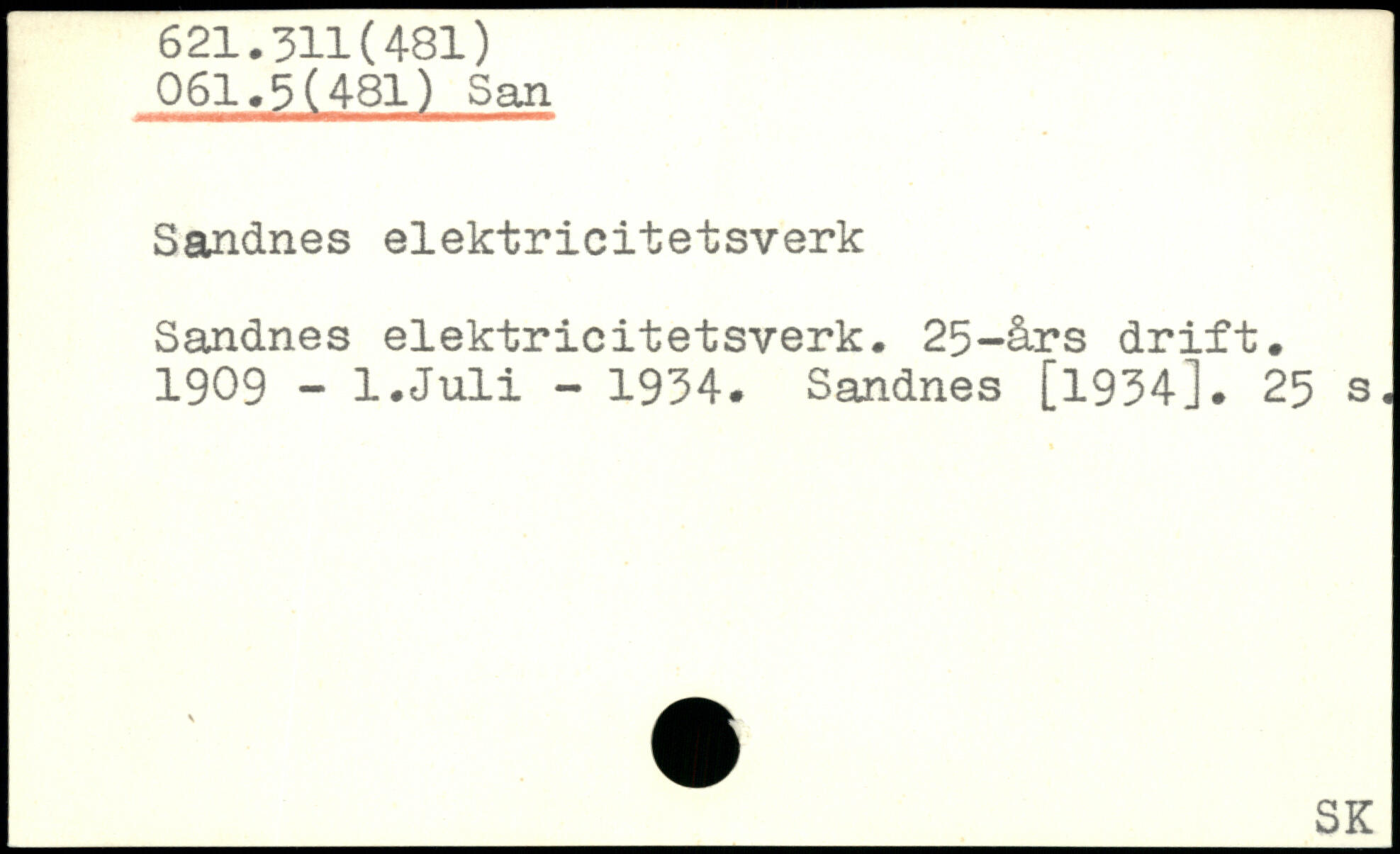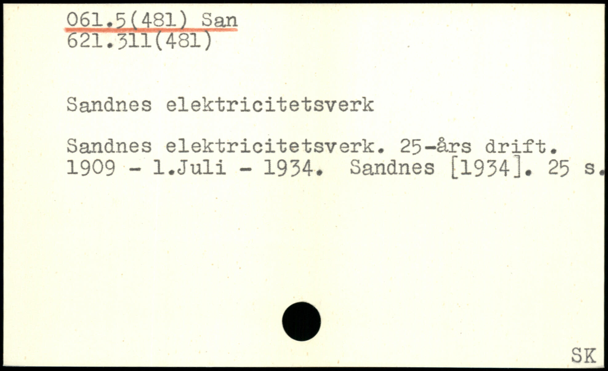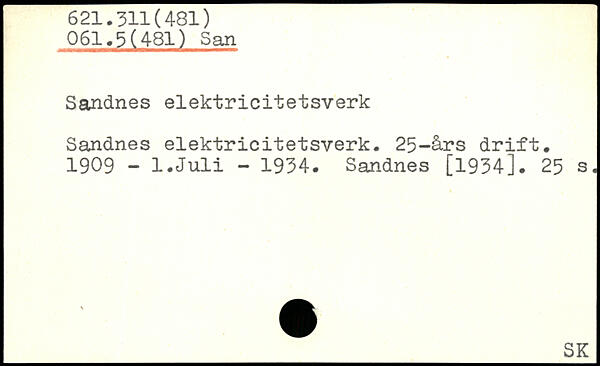 Sandnes elektricitetsverk Sandnes elektricitetsverk. 25-års drift. 1909 - l.Juli - 1934. Sandnes [1934].