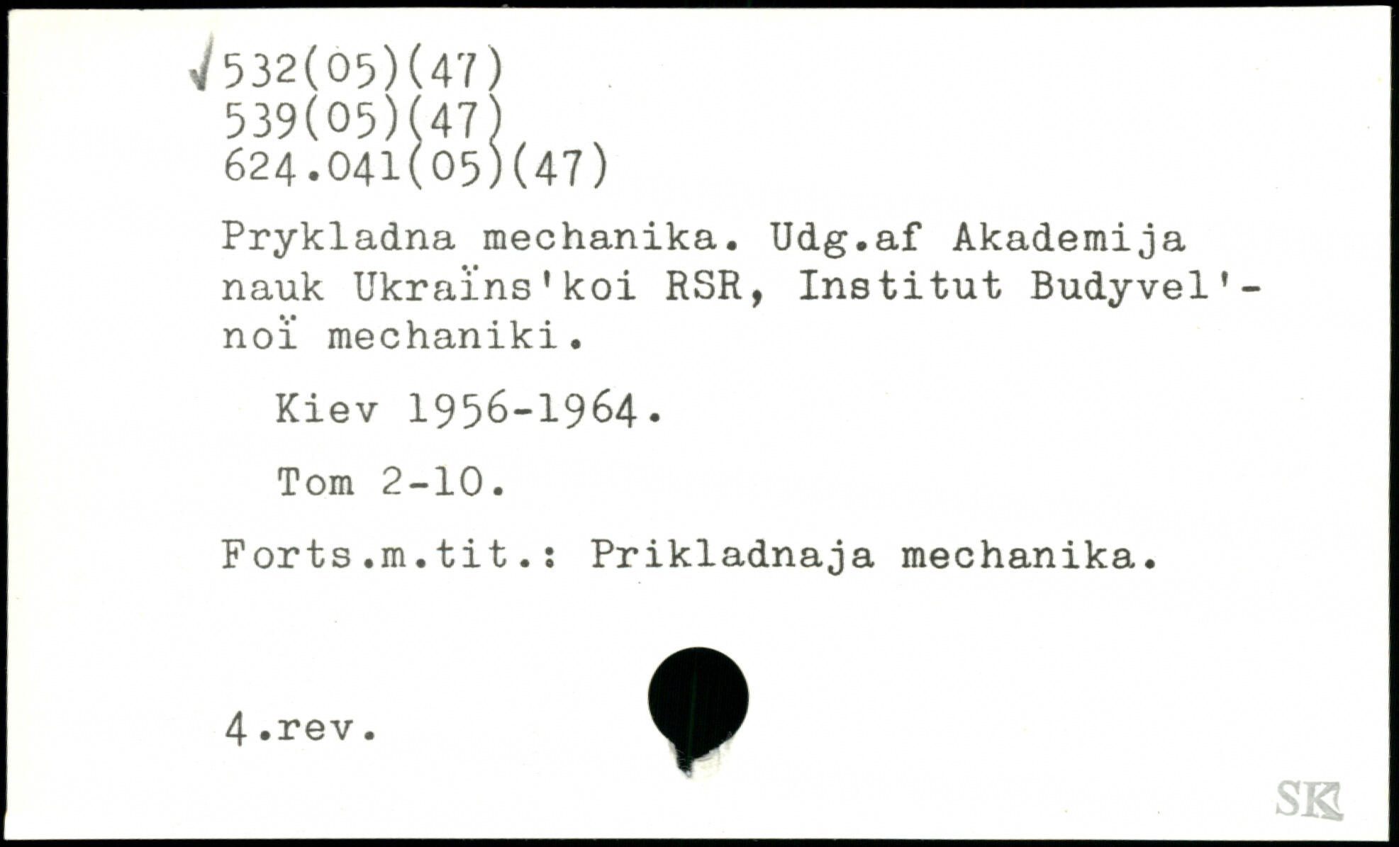 Prykladna mechanika. Udg.af Akademija nauk Ukraïns'koi RSR, Institut Budyvelf- noi mechaniki. Kiev 1956-1964. Tom 2-10. Forts.m.tit.: Prikladnaja mechanika. _ SK