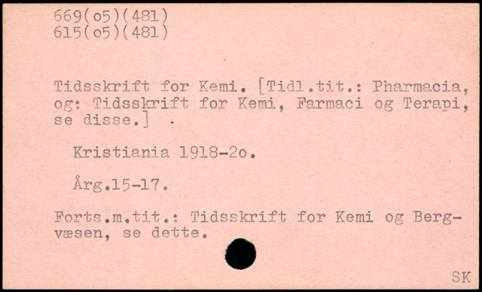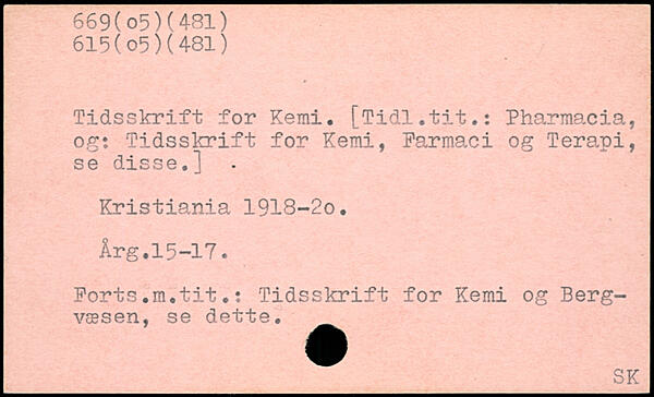 Tidsskrift for Kemi, [Tidl.tit.: Pharmacia, og: Tidsskrift for Kemi, Farmaci og Terapi, se disse.] Kristiania 1918~2o. Arg.15-17. Forts.m.tit.: Tidsskrift for Kemi og Berg-væsen, se dette.