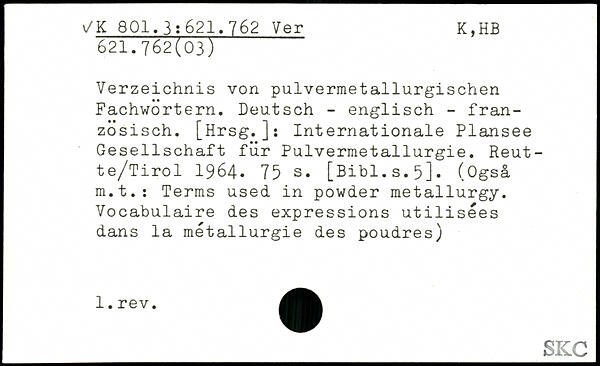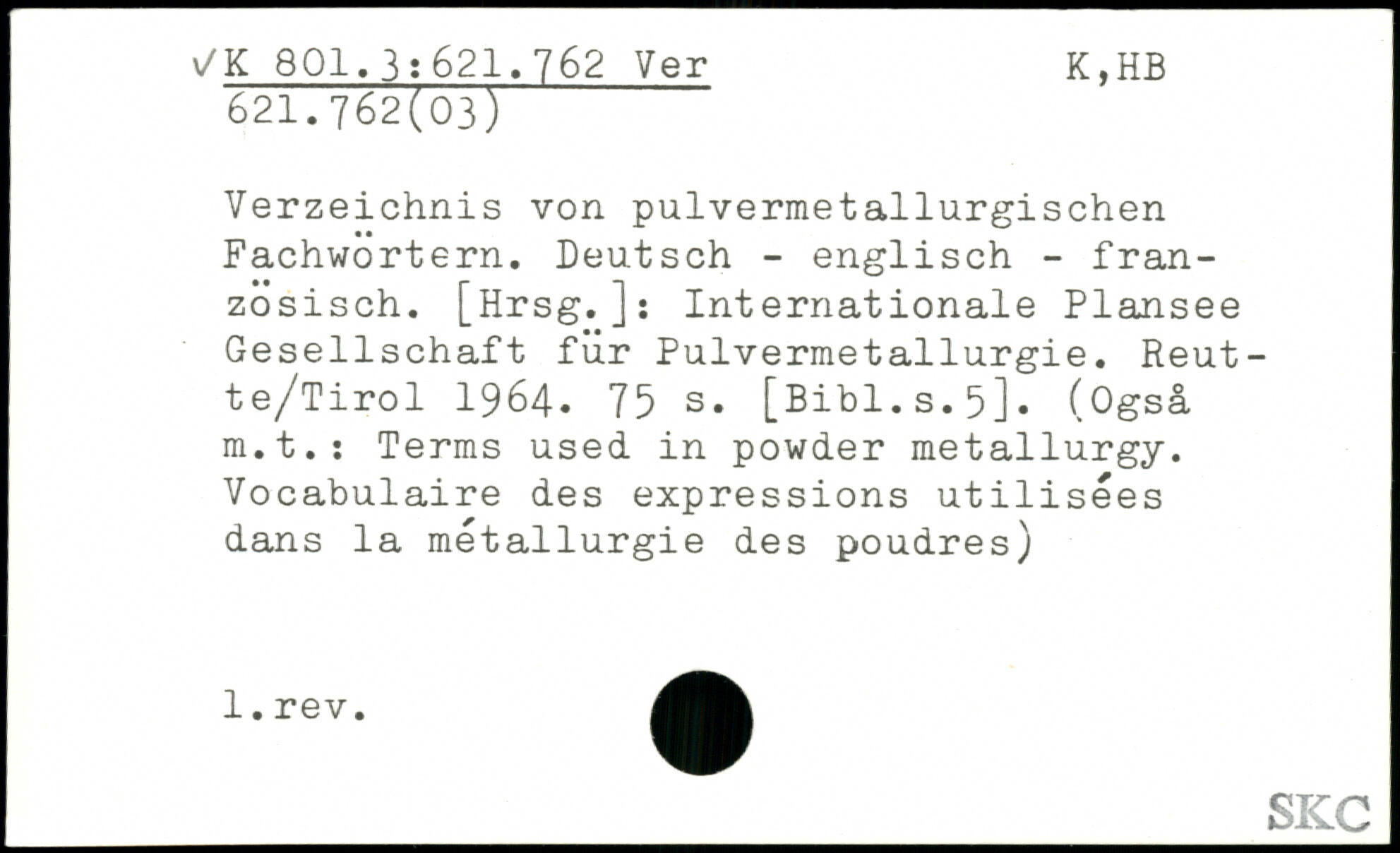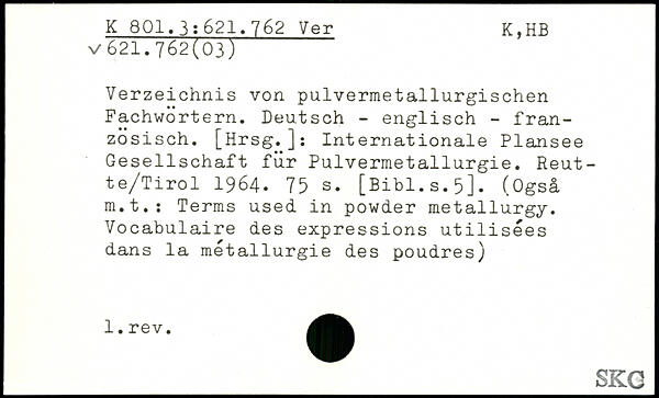 Verzeichnis von pulvermetallurgischen Fachwörtern. Deutsch - englisch - französisch. [Hrsg.]: Internationale Plansee Gesellschaft für Pulvermetallurgie. Reut-te/Tirol 1964.