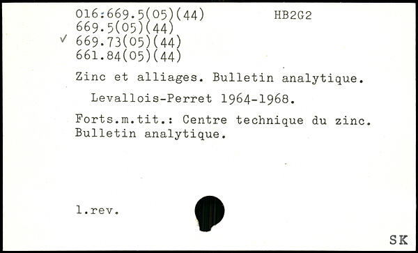 Zinc et alliages. Bulletin analytique. Levallois-Perret 1964-1968. Fort s.m.tit.: Centre technique du zinc. Bulletin analytique.
