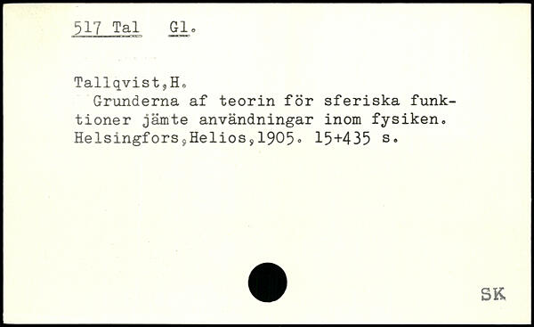 Grunderna af teorin för sferiska funktioner jämte användningar inom fysiken., Helsingfors9Helios,1905-