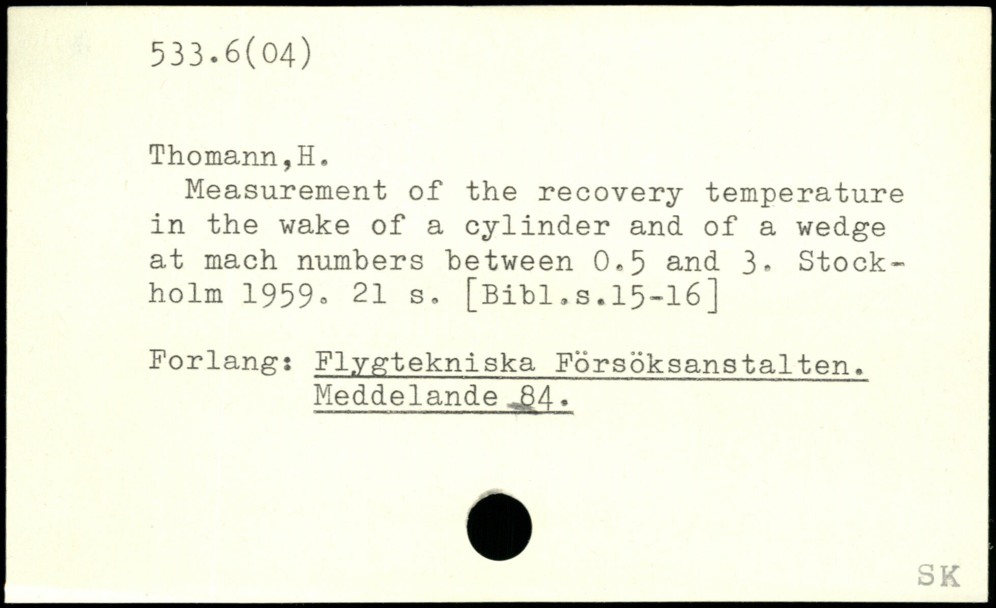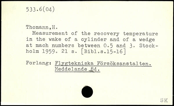 Measurement of the recovery temperature in the wake of a cylinder and of a wedge at mach numbers between 0,5 and 3, Stock” holm 1959