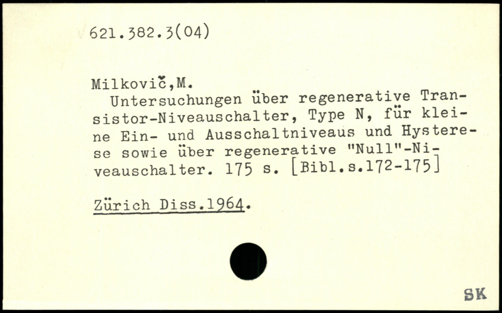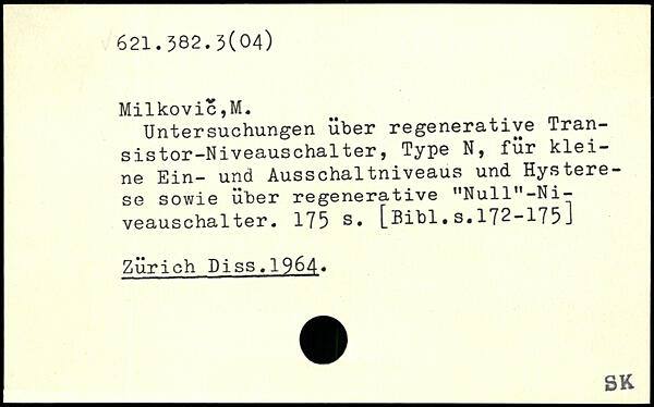 Untersuchungen über regenerative Transistor-Niveauschalter, Type N, für kleine Ein- und Ausschaltniveaus und Hysterese sowie über regenerative "Null"-Ni-veauschalter.