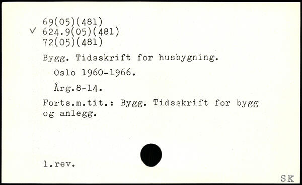 Bygg. Tidsskrift for husbygning. Oslo 1960-1966. Årg.8-14. Forts.m.tit.: Bygg. Tidsskrift for bygg og anlegg.
