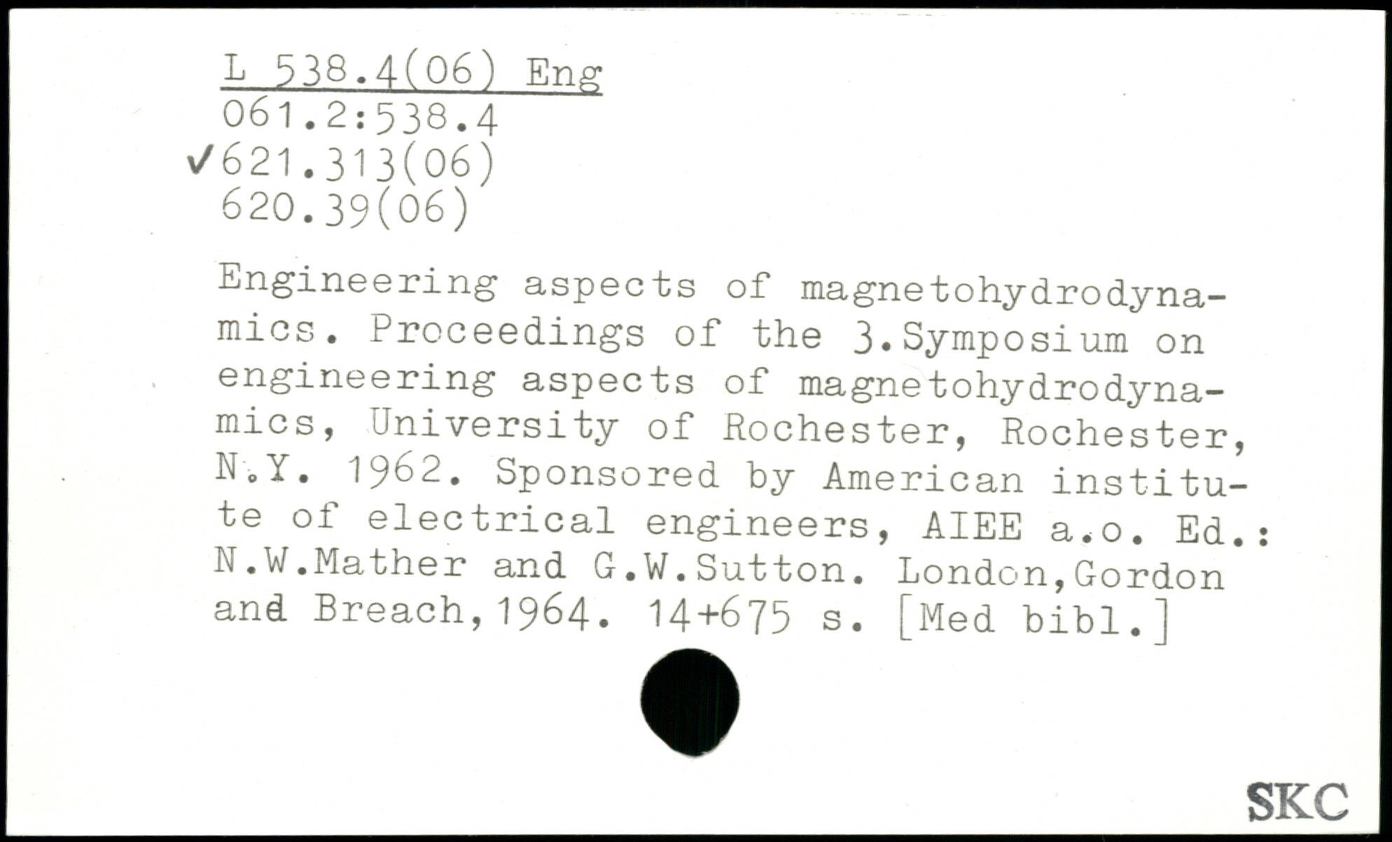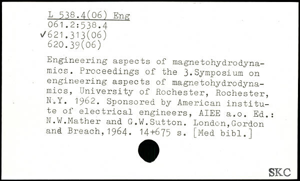 Engineering aspects of magnetohydrodynamics. Proceedings of the 3.Symposium on engineering aspects of magnetohydrodyna-mics, University of Rochester, Rochester, N.Y. 1962. Sponsored by American institute of electrical engineers, AIEE a.o. Ed.: N.W.Mather and G.W.Sutton.