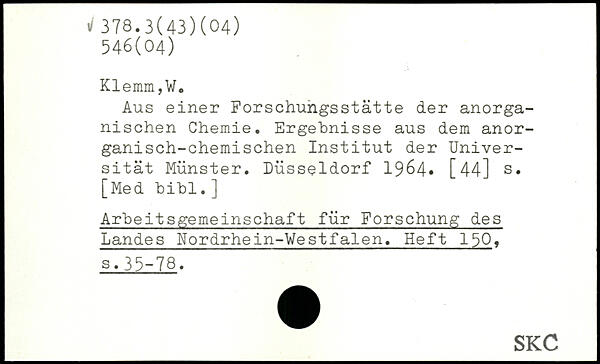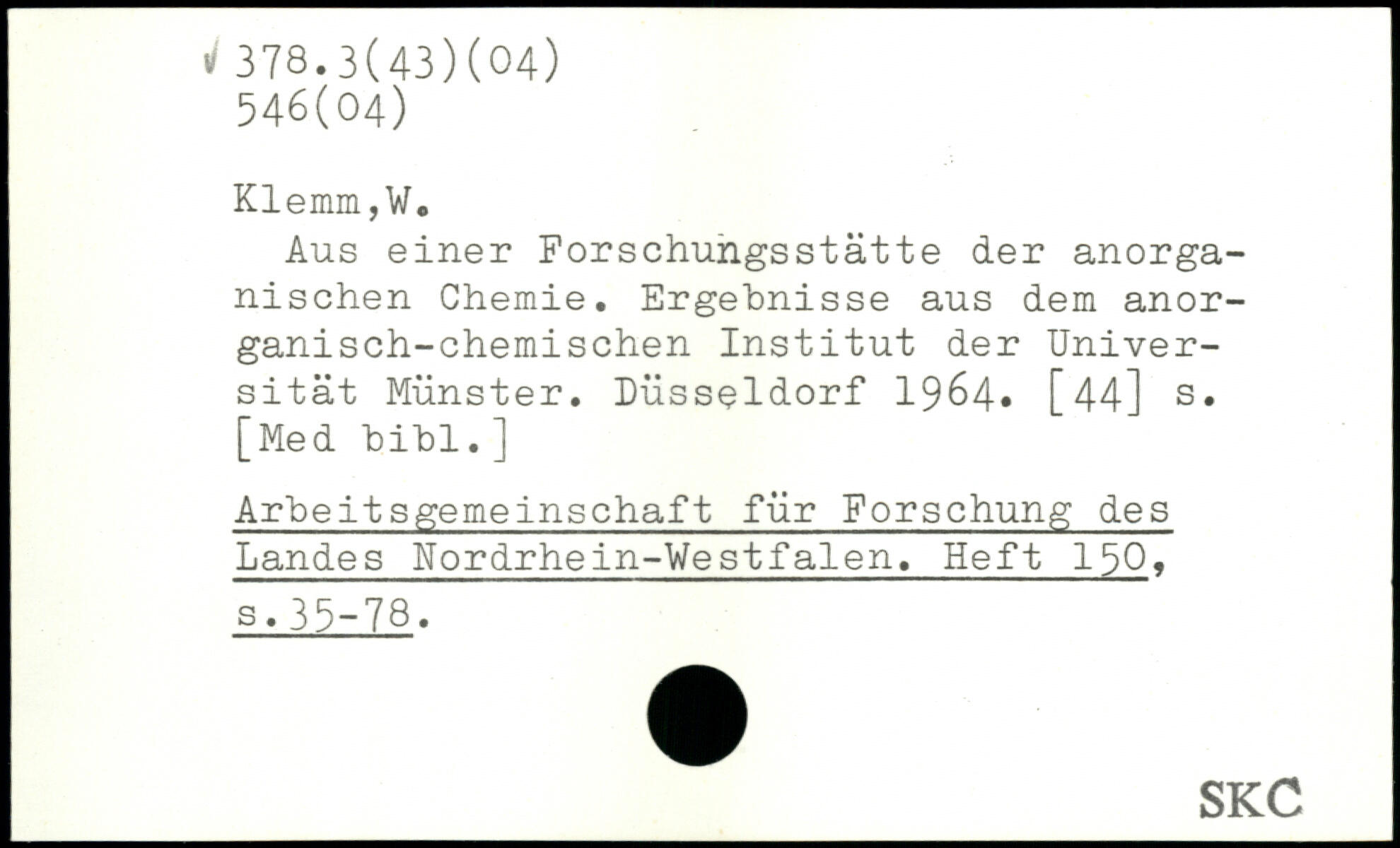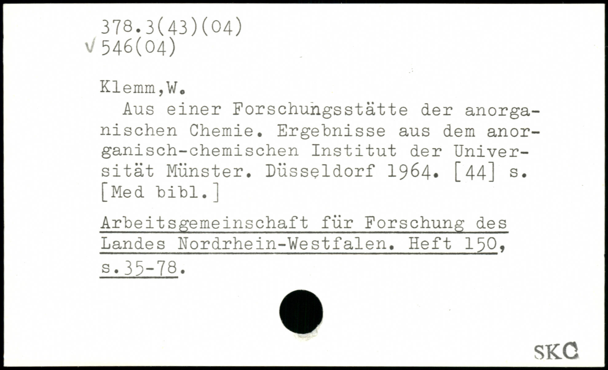 Aus einer Forschungsstätte der anorganischen Chemie. Ergebnisse aus dem anorganisch-chemischen Institut der Universität Münster. Düsseldorf 1964. [44] s. [Med bibl.] Arbeitsgemeinschaft für Forschung des Landes Kordrhein-Westfalen. Heft 150.