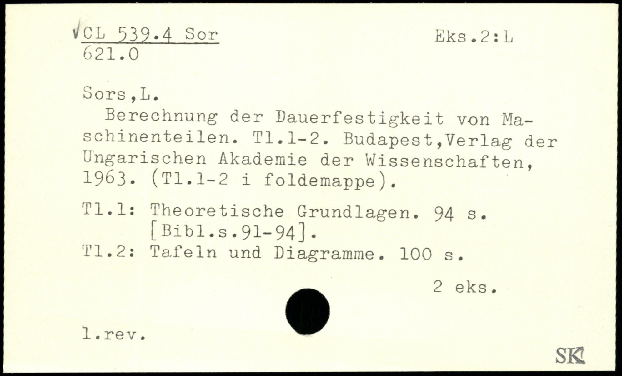 Berechnung der Dauerfestigkeit von Maschinenteilen. TI.1-2. Budapest,Verlag der Ungarischen Akademie der Wissenschaften, 1963. (Tl.1-2 i foldemappe). Tl.l: Theoretische Grundlagen.