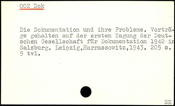 Die Dokumentation und ihre Probleme. Vorträge gehalten auf der ersten Tagung der Deutschen Gesellschaft für Dokumentation 1942 ir Salzburg.