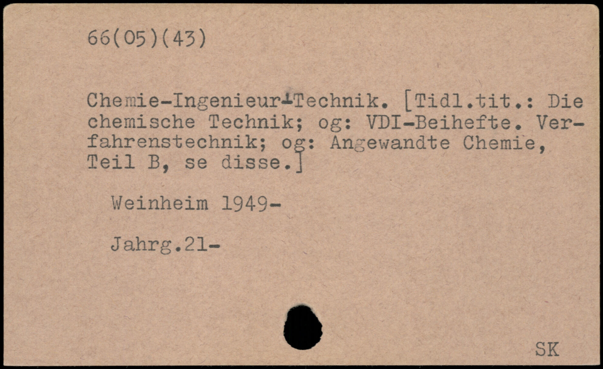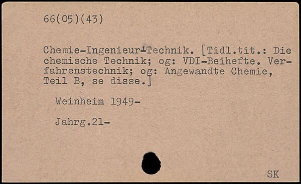 Cheraie-IngenieuriTechnik. [Tidl.tit.: Die chemische Technik; og: VDI-Beihefte. Verfahrenstechnik; og: Angewandte Chemie, Teil B, se disse.j Weinheim 1949- Jahrg.21-
