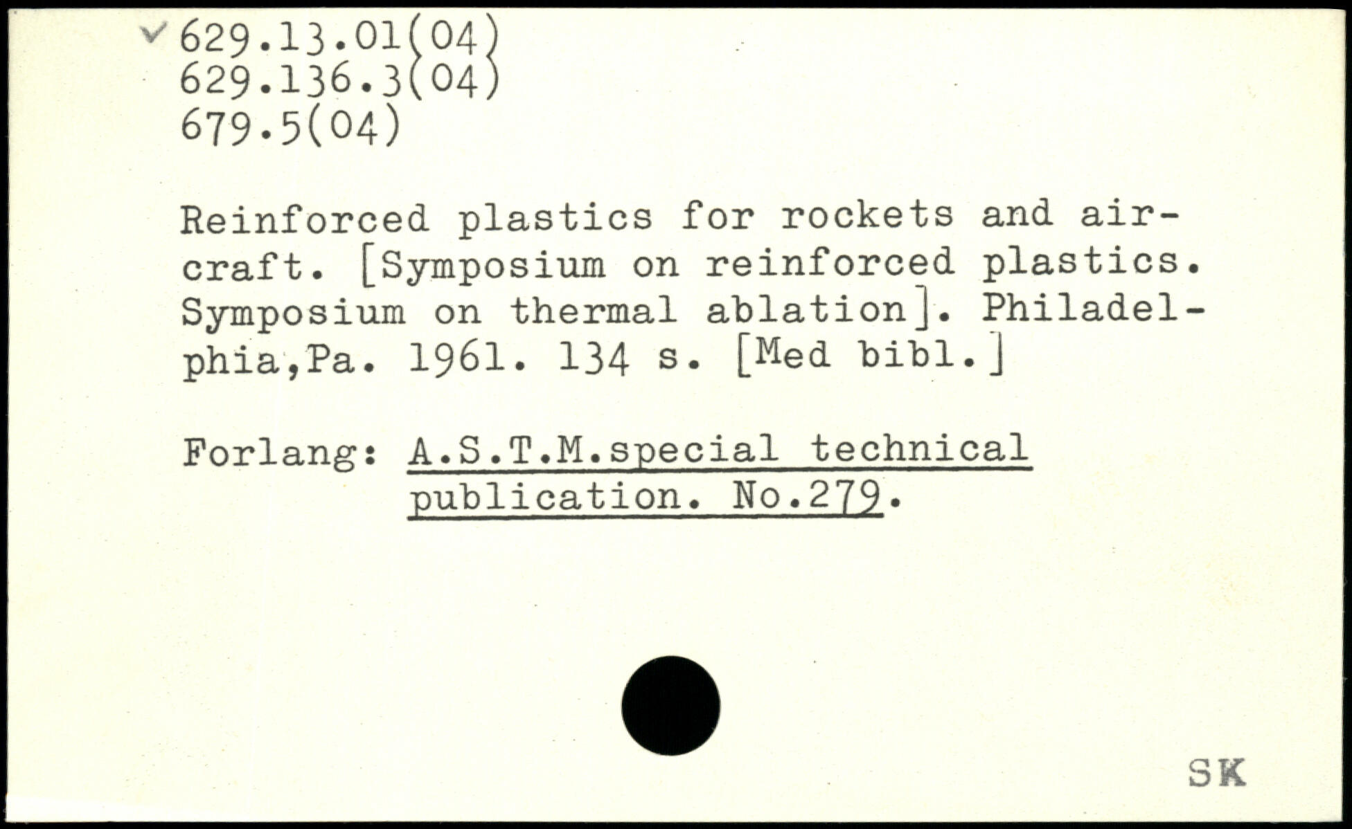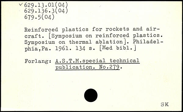 Reinforced plastics for rockets and aircraft. [Symposium on reinforced plastics. Symposium on thermal ablation]. Philadelphia,Pa. 1961.