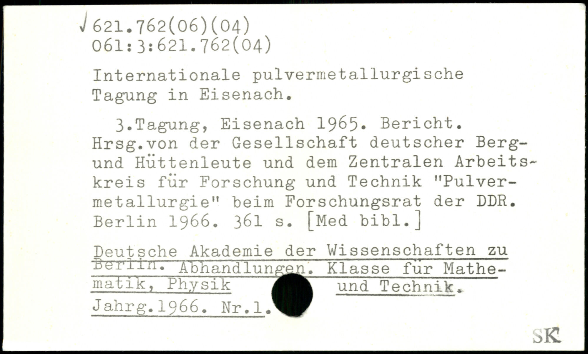Internationale pulvermetallurgische Tagung in Eisenach. 3.Tagung, Eisenach 1965, Bericht. Hrsg.von der Gesellschaft deutscher Berg-und Hüttenleute und dem Zentralen Arbeitskreis für Forschung und Technik "Pulvermetallurgie" beim Forschungsrat der DDR.