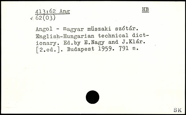 Angol - magyar miiszaki szotar. English-Hungarian technical dictionary. Ed.by E.Nagy and J.Klar.