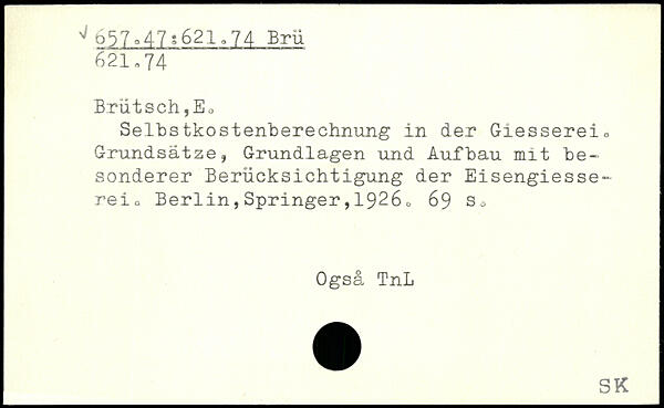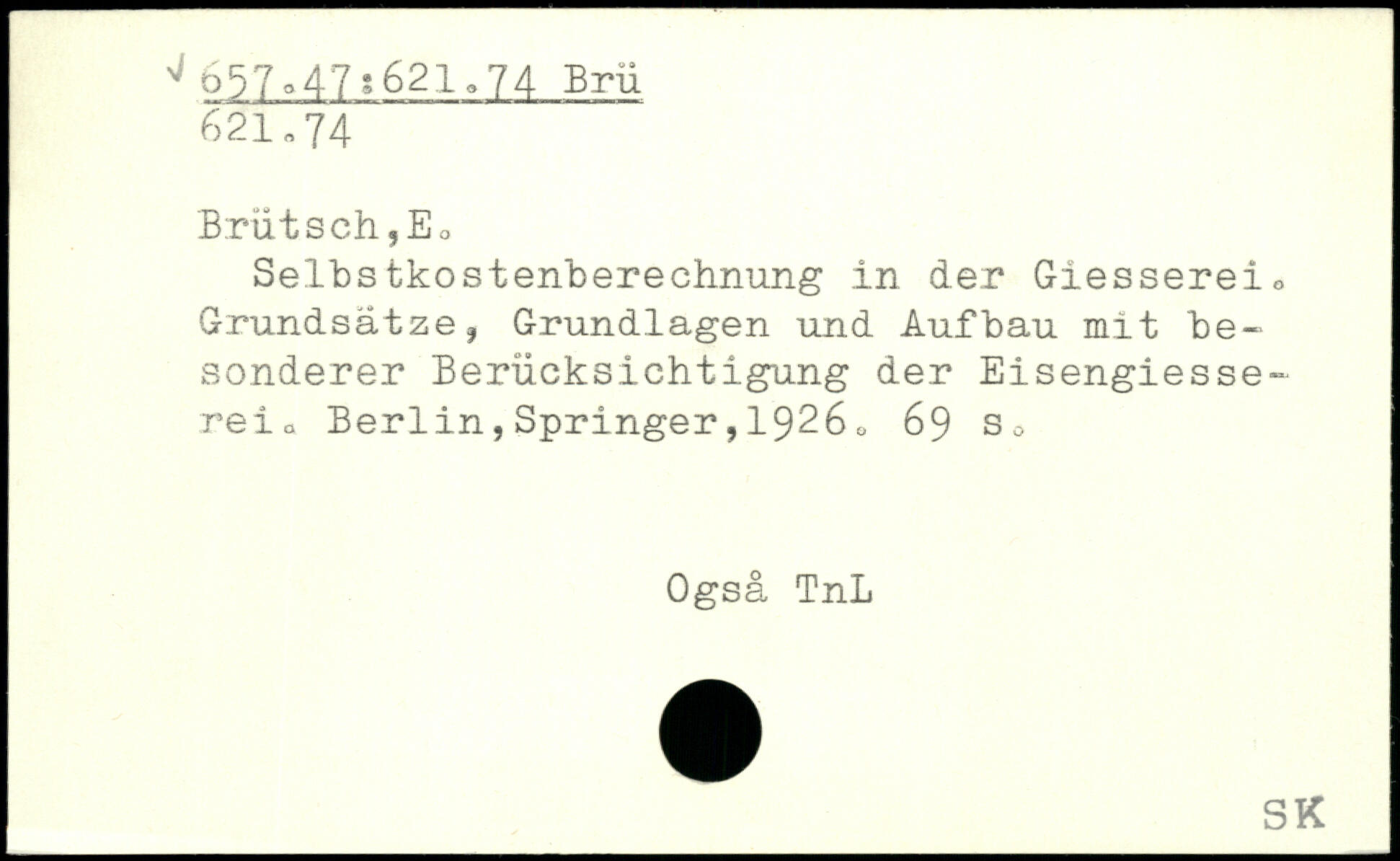 B.rütschjEo Selbstkostenberechnung in der Giessereio Grundsätze, Grundlagen und Aufbau mit besonderer