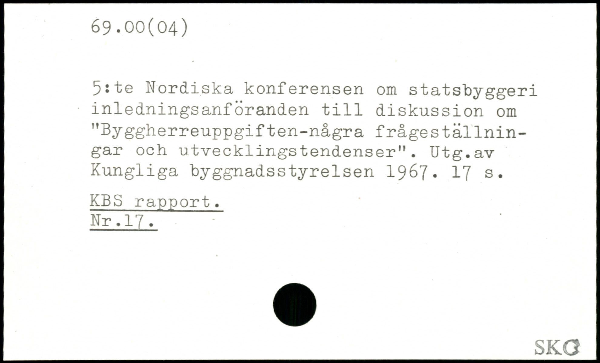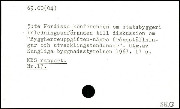 5:te Nordiska konferensen om statsbyggeri inledningsanföranden till diskussion om "Byggherreuppgiften-några frågeställnin-gar och utvecklingstendenser". Utg.av Kungliga byggnadsstyrelsen 1967.