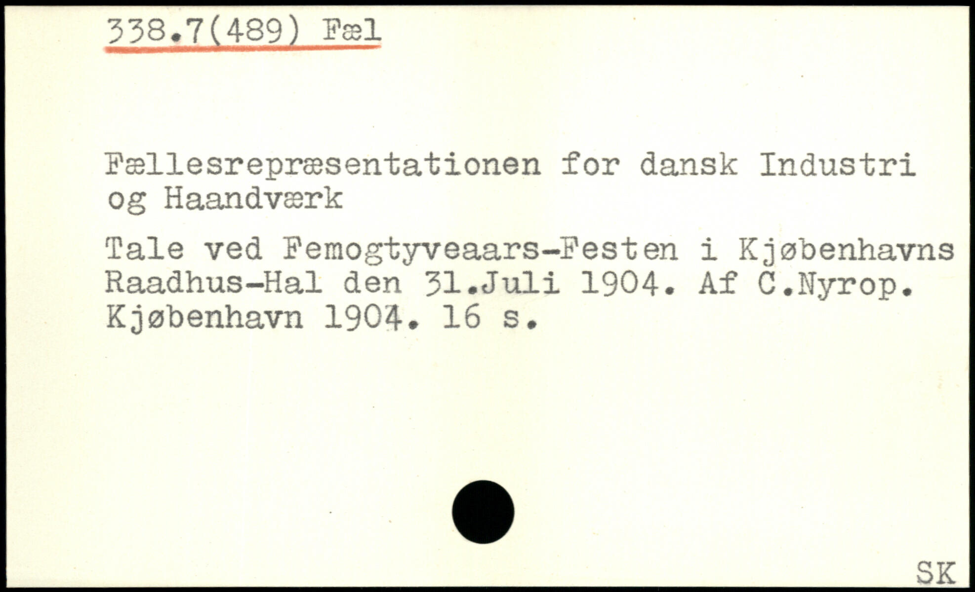 Fællesrepræsentationen for dansk Industri og Haandværk Tale ved Femogtyveaars-Festen i Kjøbenhavns Raadhus-Hal den 31.Juli 1904. Af C.Nyrop. Kjøbenhavn 1904.