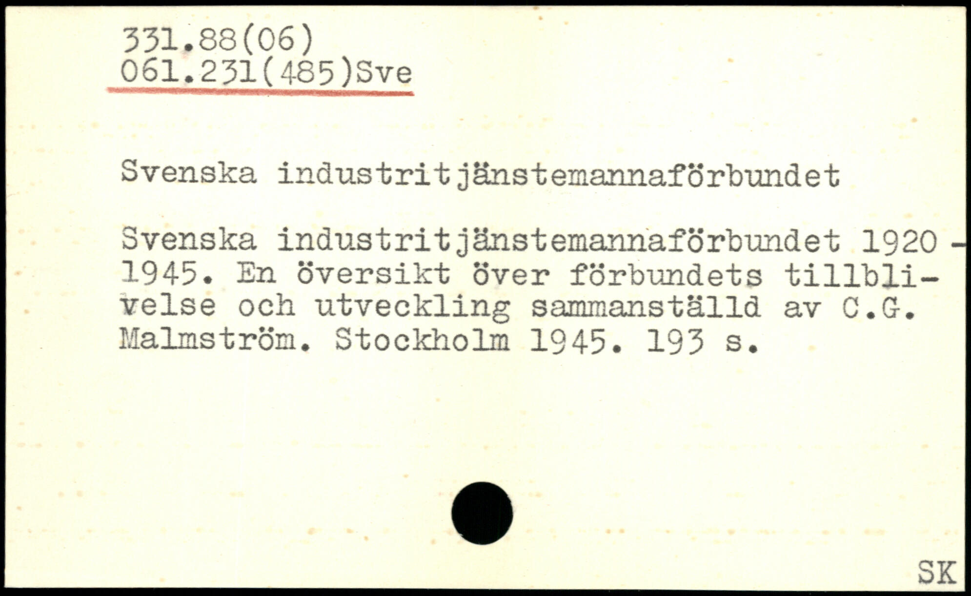 Svenska industritjänstemannaförbundet Svenska industrit jänstemannaförbundet 1920 -1945. En översikt över förbundets tillblivelse och utveckling sammanställd av C.G-. Malmström.