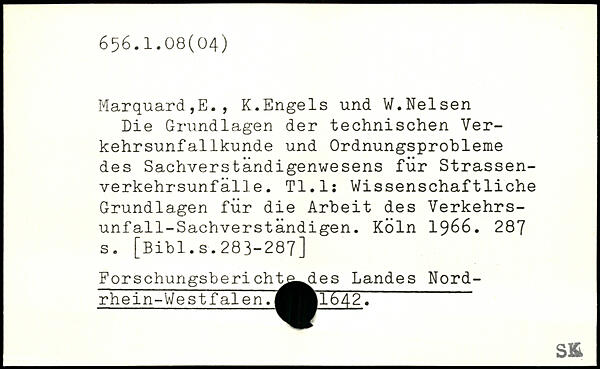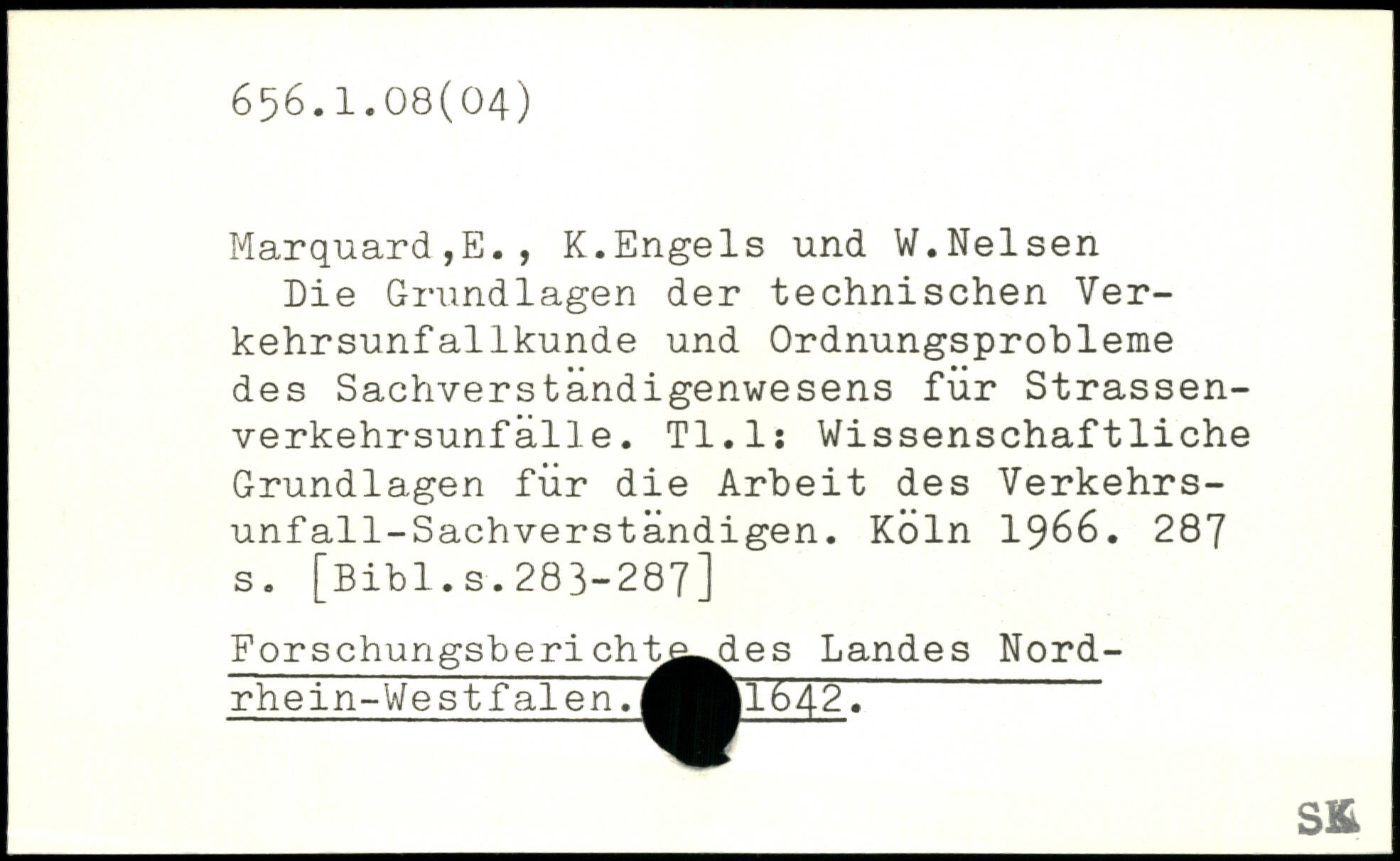 Marquard,E., K.Engels und W.Nelsen Die Grundlagen der technischen Verkehrsunfallkunde und Ordnungsprobleme des Sachverständigenwesens für Strassen-verkehrsunfalle. Tl.l: Wissenschaftliche Grundlagen für die Arbeit des Verkehrsunfall-Sachverständigen.