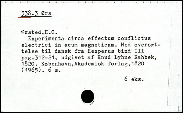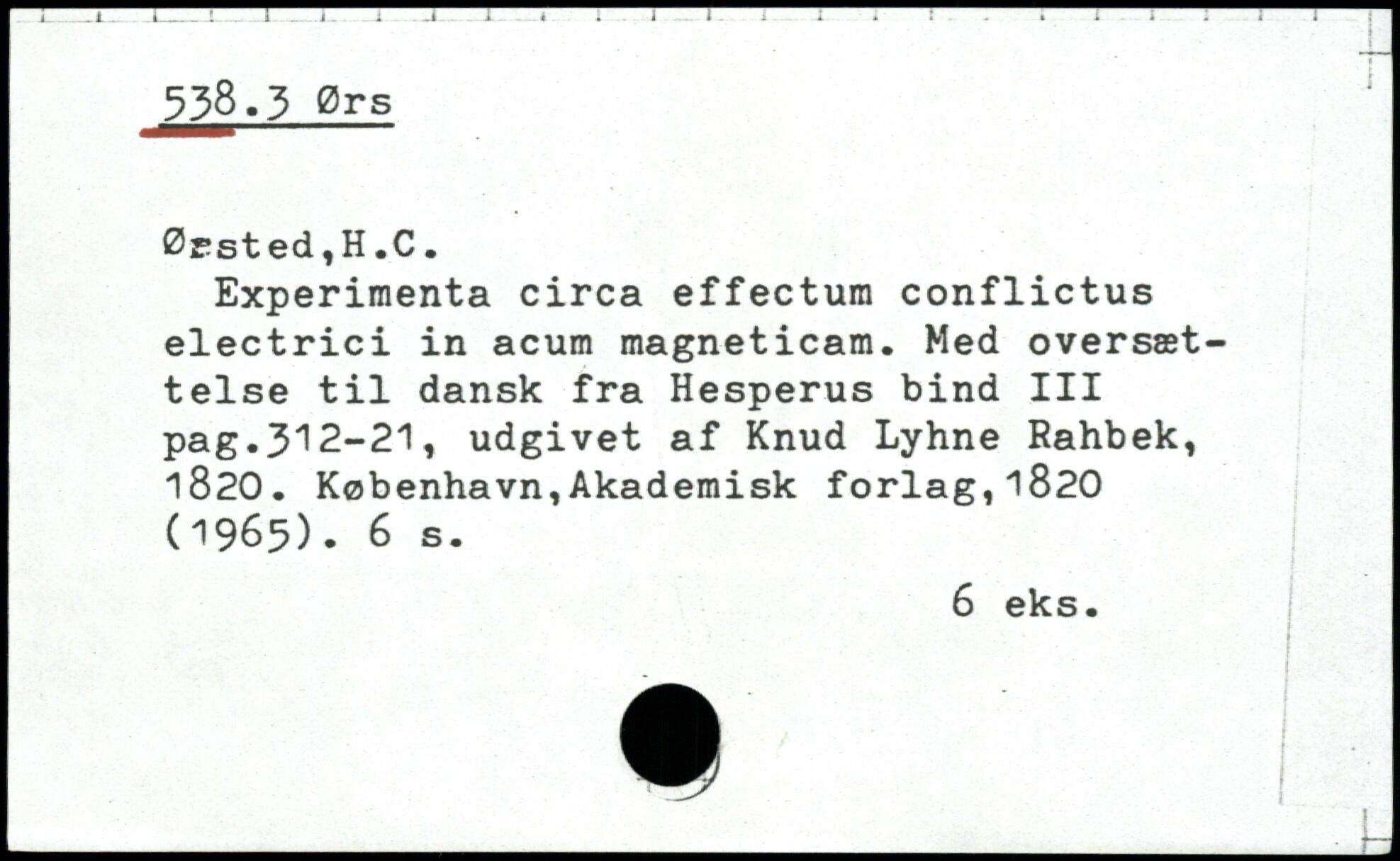 Experiraenta circa effectum conflictus electrici in acum magneticam. Med oversættelse til dansk fra Hesperus bind III pag.312-21, udgivet af Knud Lyhne Rahbek, 1820.