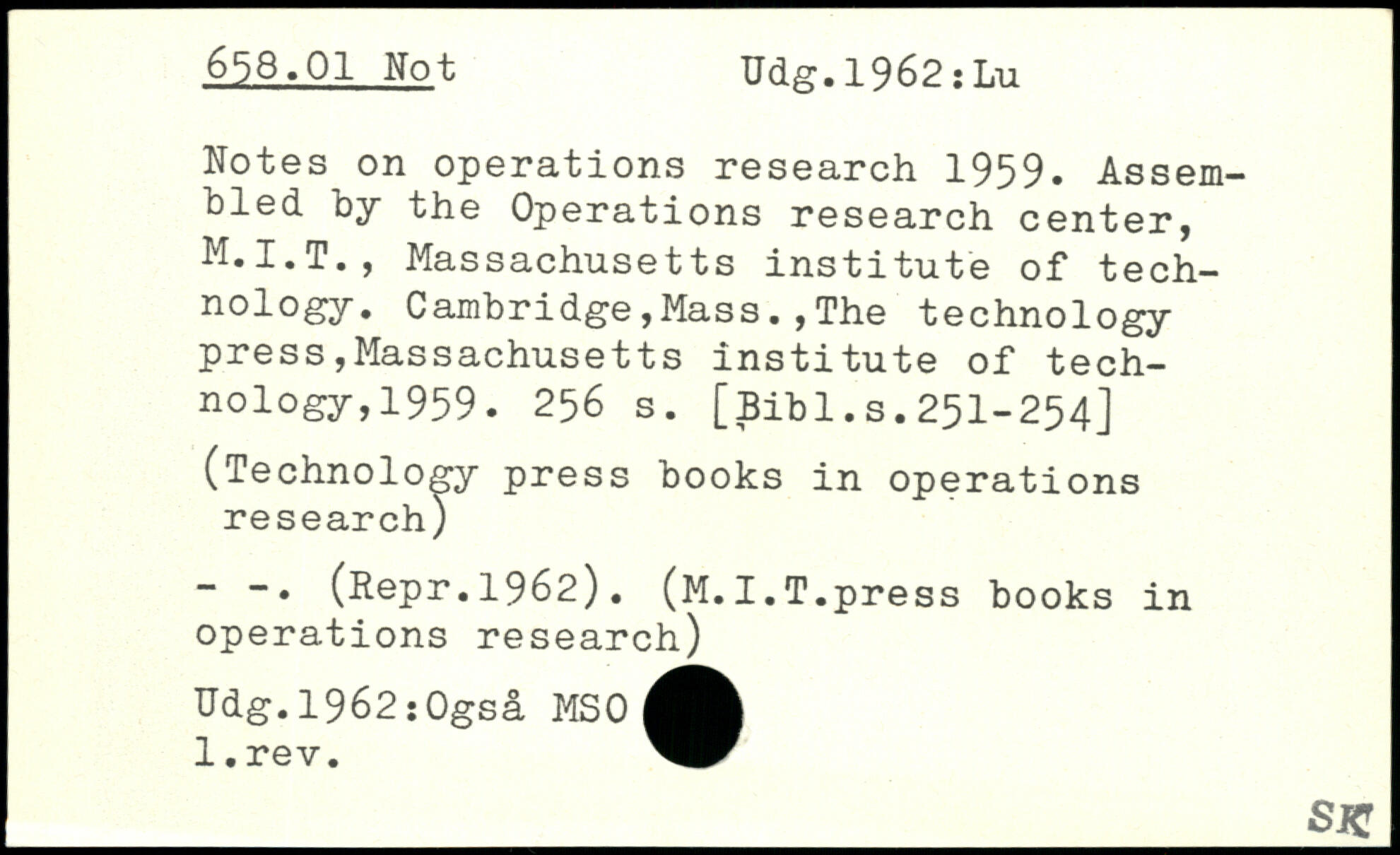 Notes on operations research 1959. Assembled by the Operations research center, Massachusetts institute of technology. Cambridge,Mass.,The technology press Massachusetts institute of tech-nology,1959.