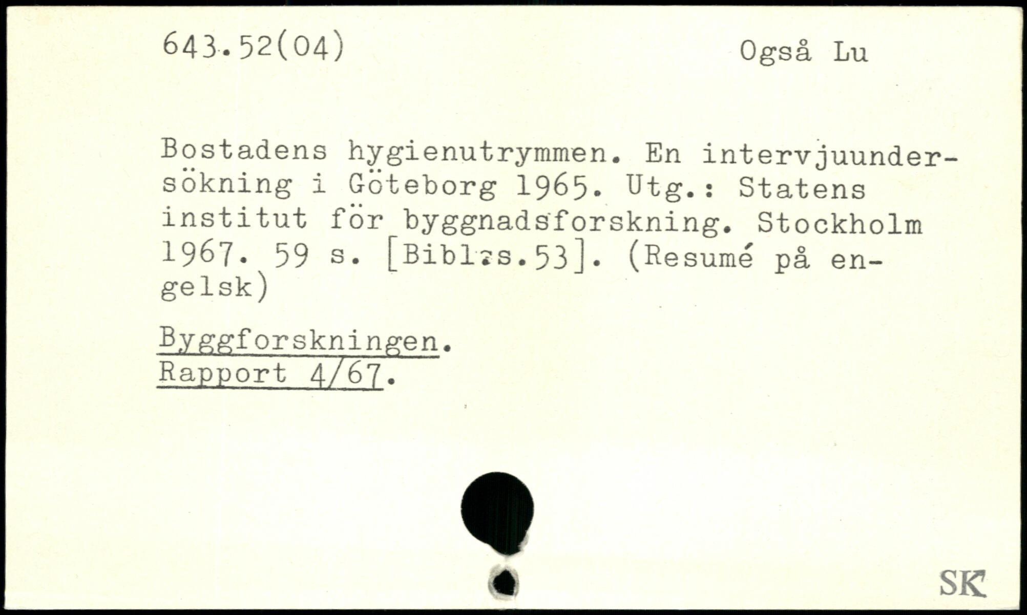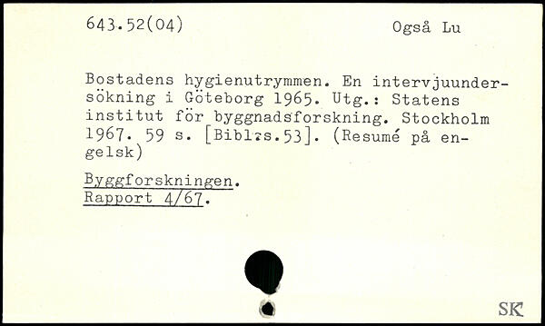 Bostadens hygienutrymmen. En intervjuundersökning i Göteborg 1965. Utg.: Statens institut för byggnadsforskning.