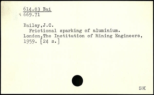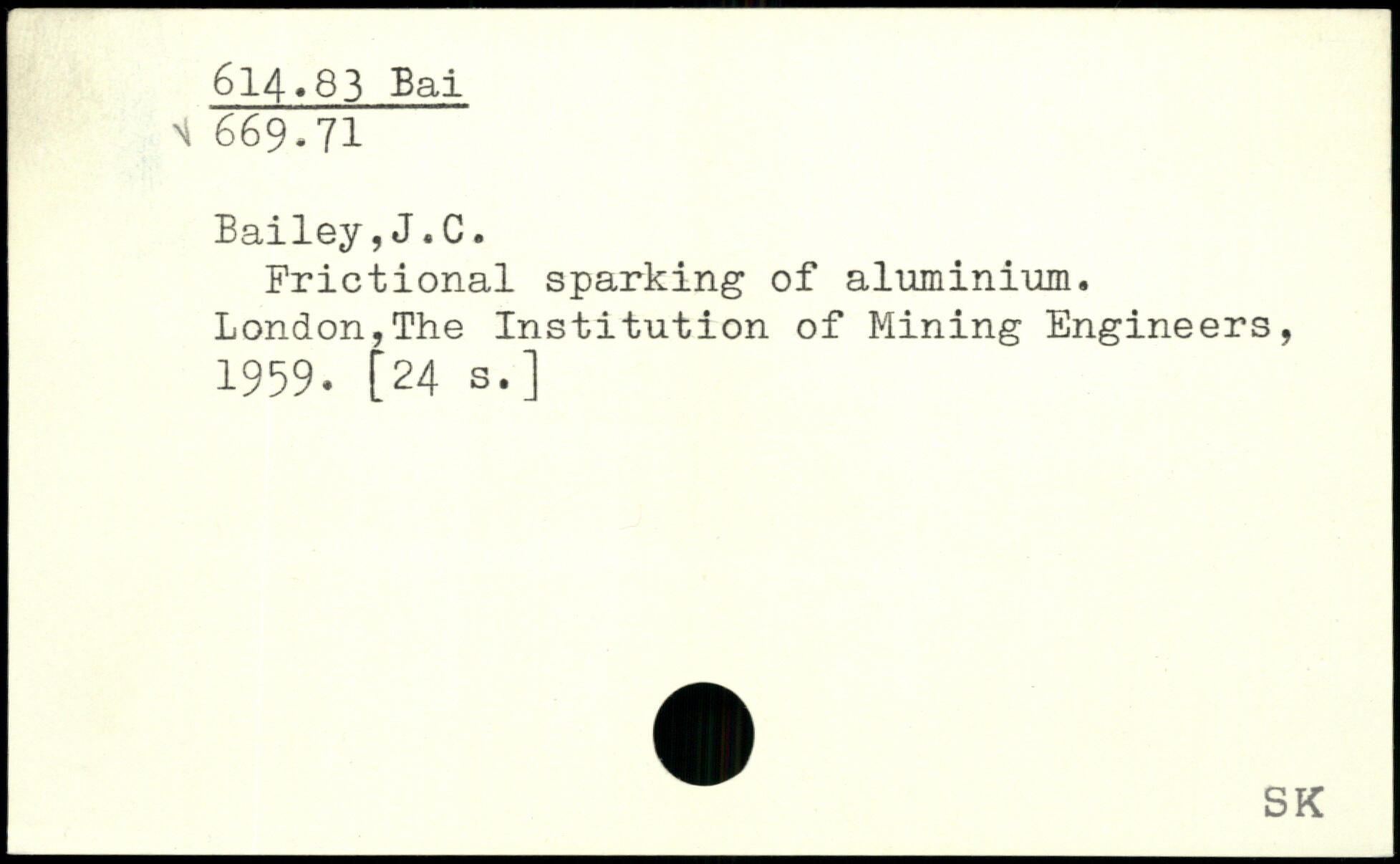 Frictional sparking of aluminium. London,The Institution of Mining Engineers, 1959. [