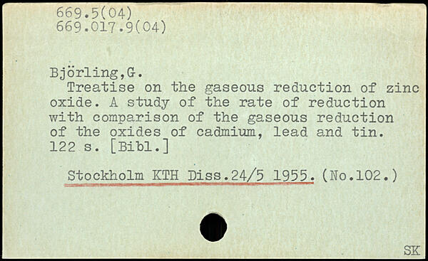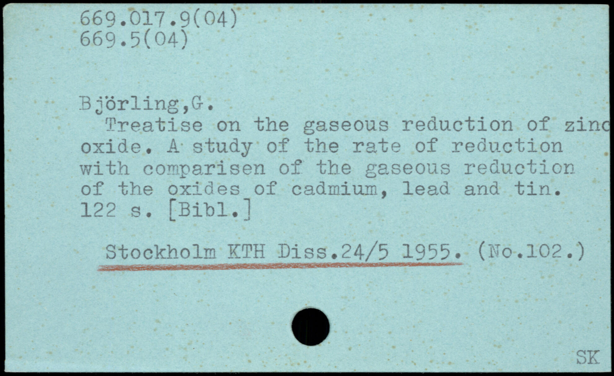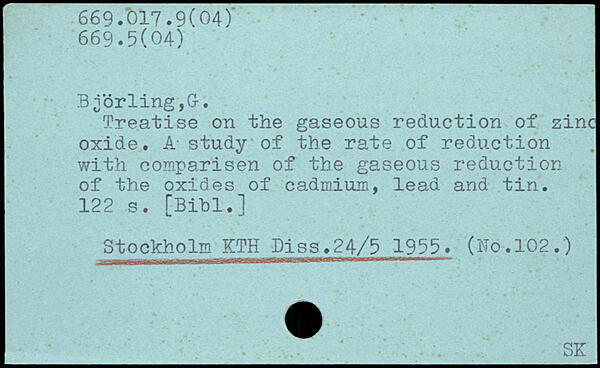Treatise on the gaseous reduction of zinc oxide. A study of the rate of reduction with comparison of the gaseous reduction of the oxides of cadmium, lead and tin.