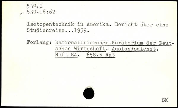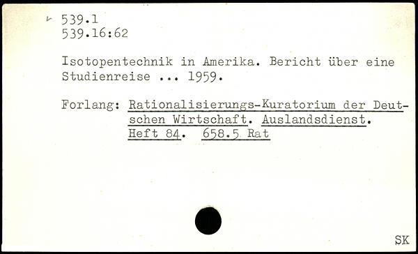 Isotopentechnik in Amerika. Bericht über eine Studienreise ... 1959. Forlang: Rationalisierungs-Kuratorium der Deutschen Wirtschaft. Auslandsdienst. Heft 84. 658.5 Rat