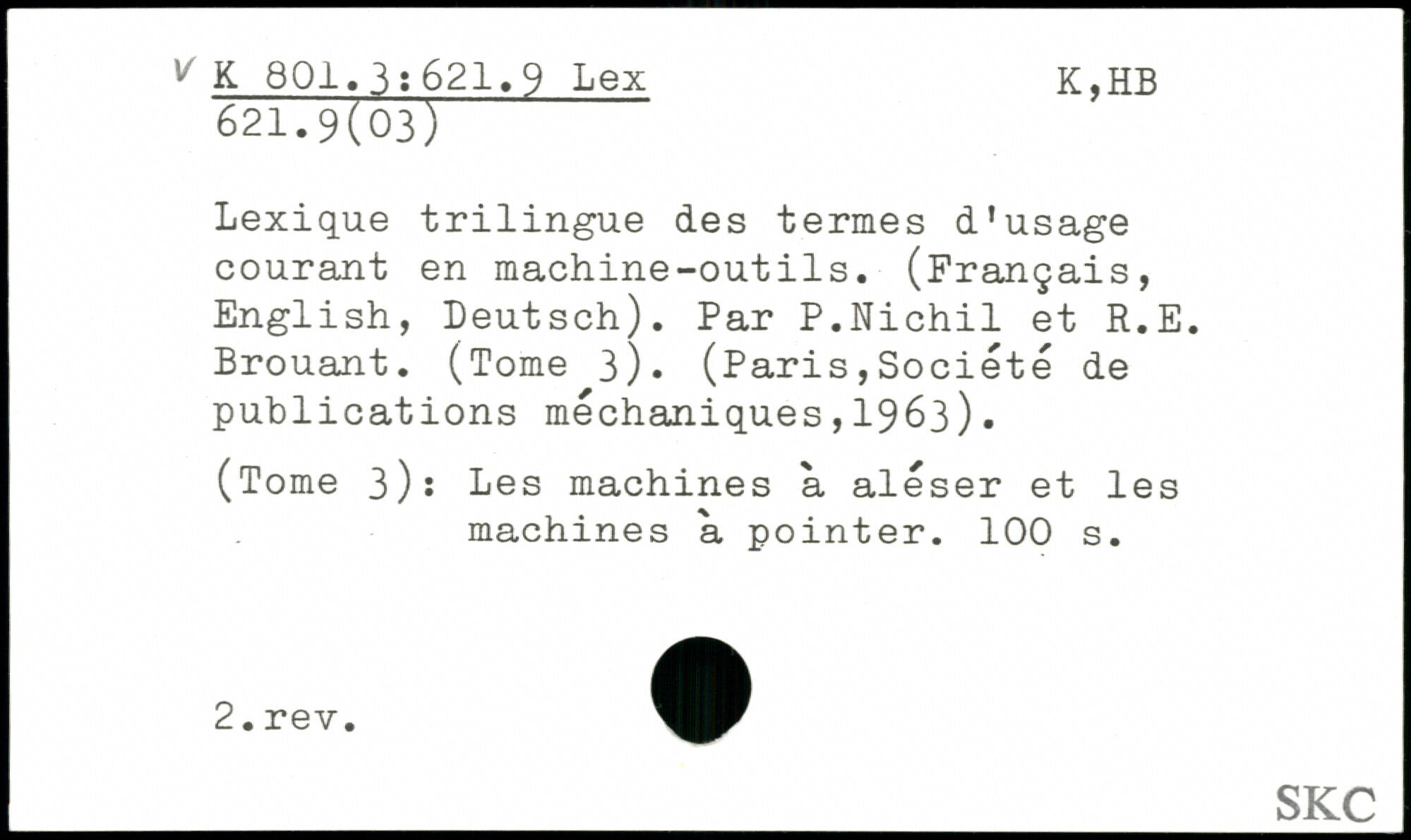 Lexique trilingue des termes d’usage courant en machine-outils. (Français, English, Deutsch). Par P.Nichil et R.E. Brouant. (Tome 3), (