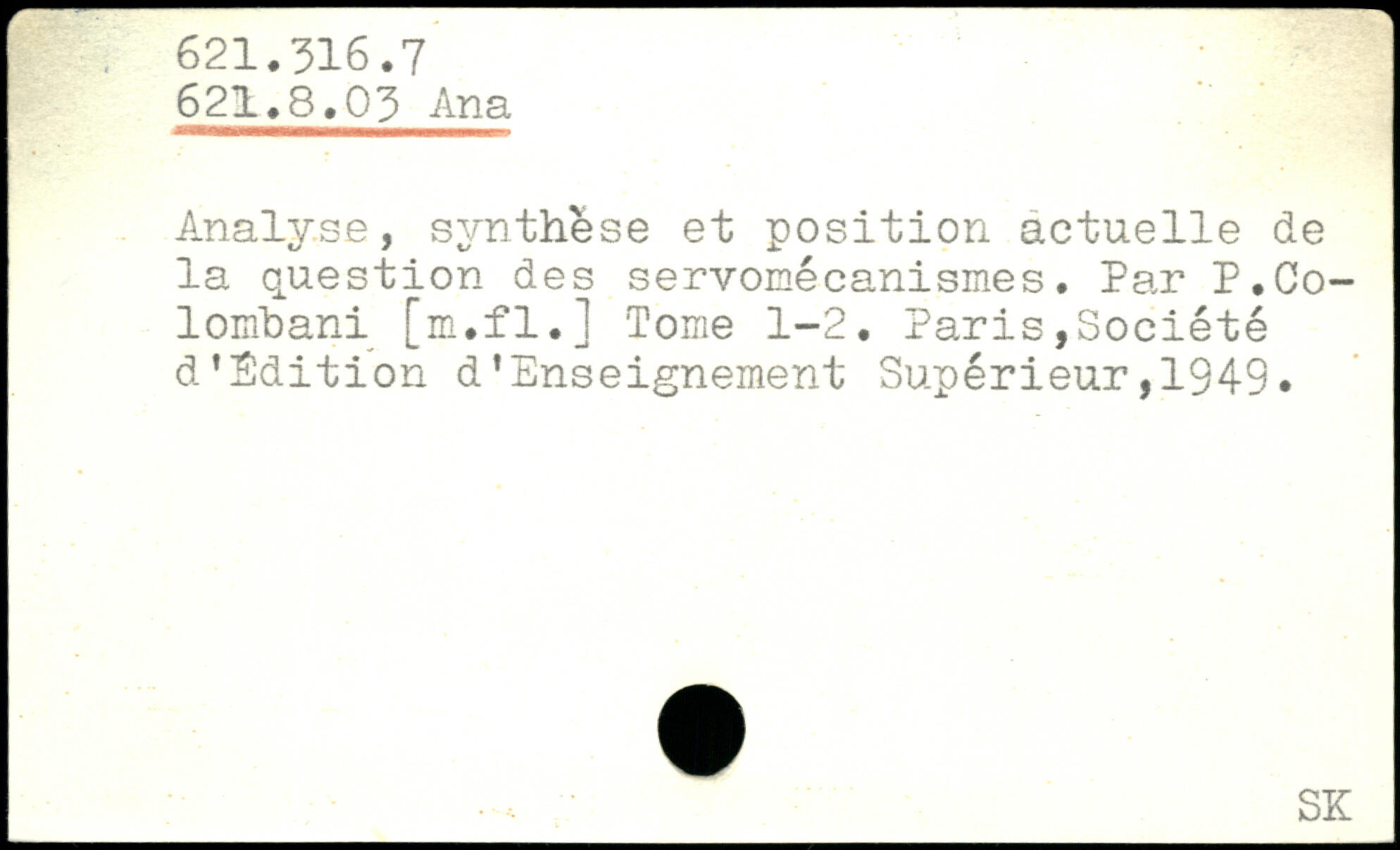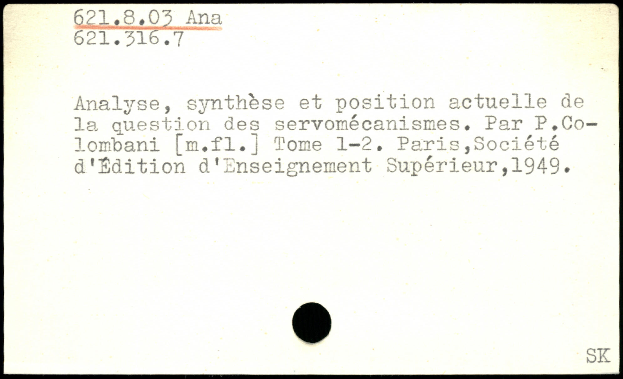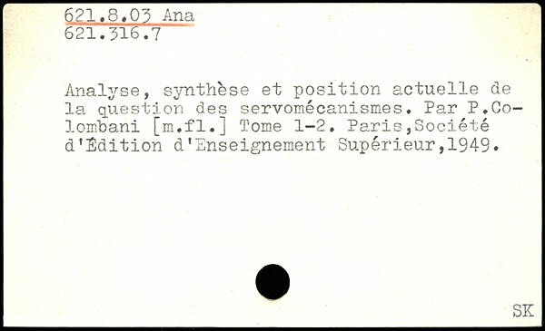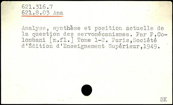Analyse, synthèse et position actuelle de la question des servomécanismes. Par P.Co-lombani [m.fl.] Tome 1-2. Paris,Société d’Sdition d’Enseignement Supérieur,1949.