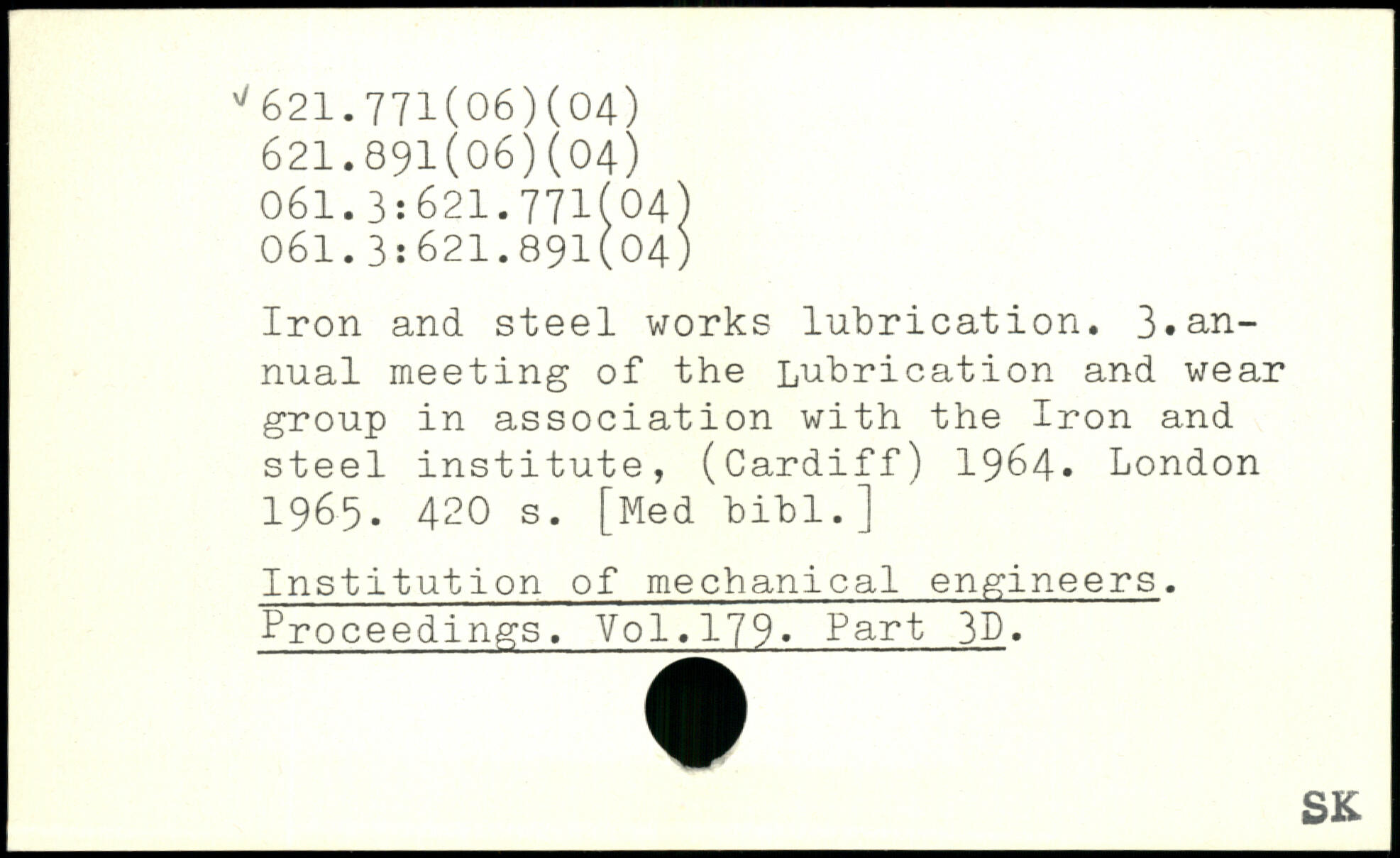 Iron and steel works lubrication. 3.an-j nual meeting of the Lubrication and wear group in association with the Iron and steel institute, (Cardiff) 1964