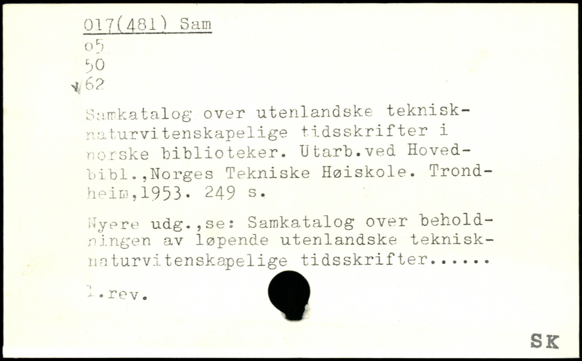 Samkatalog over utenlandske teknisk— raturvitenskapelige tidsskrifter i norske biblioteker. Utarb.ved Hoved-biblNorges Tekniske Høiskole. Trondheim, 1953-