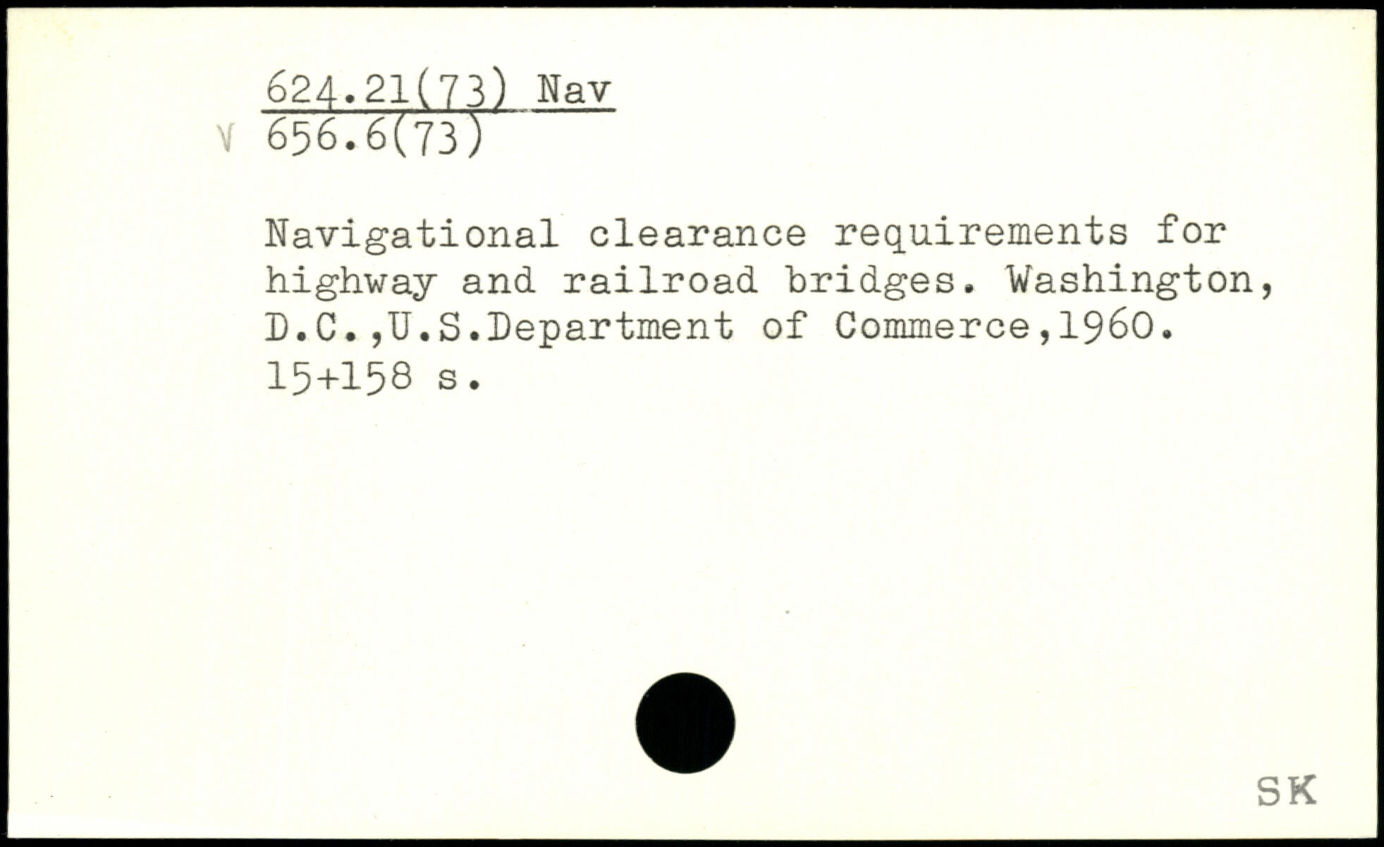 Navigational clearance requirements for highway and railroad bridges. Washington, D.C.,U.S.Department of Commerce,1960.