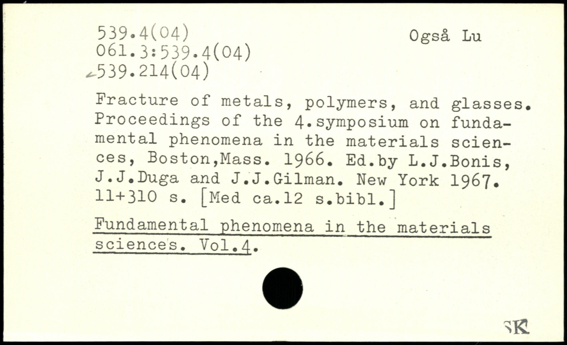 Fracture of metals, polymers, and glasses. Proceedings of the 4.symposium on fundamental phenomena in the materials sciences, Boston,Mass. 1966. Ed.by L.J.Bonis, J.J.Duga and J.J.Gilman.