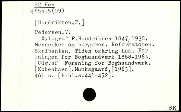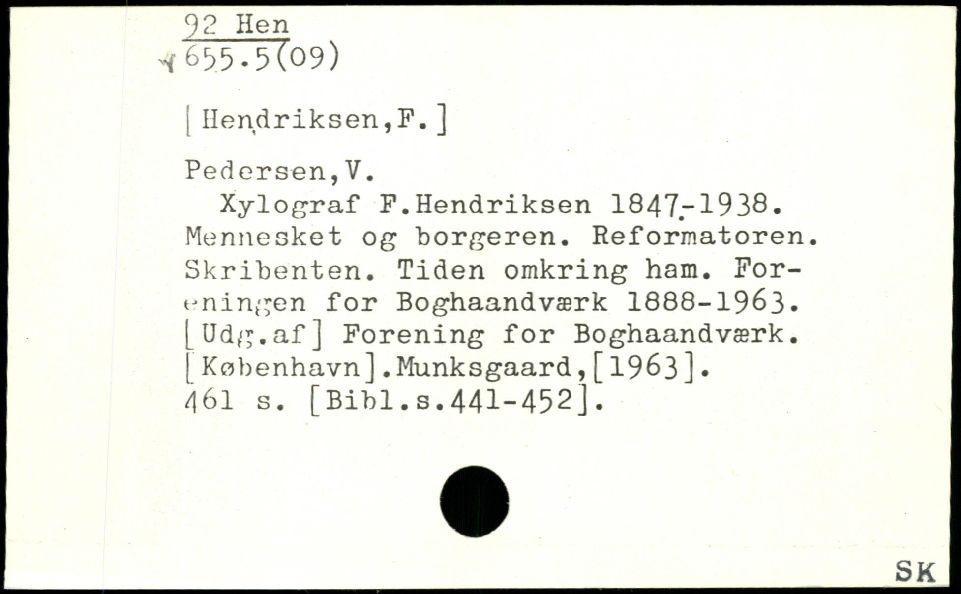 j Hendriksen,F.] Pedersen,V. Xylograf F.Hendriksen 1847.-1938. Mennesket og borgeren. Reformatoren. Skribenten. Tiden omkring ham. Foreningen for Boghaandværk 1888-1963.