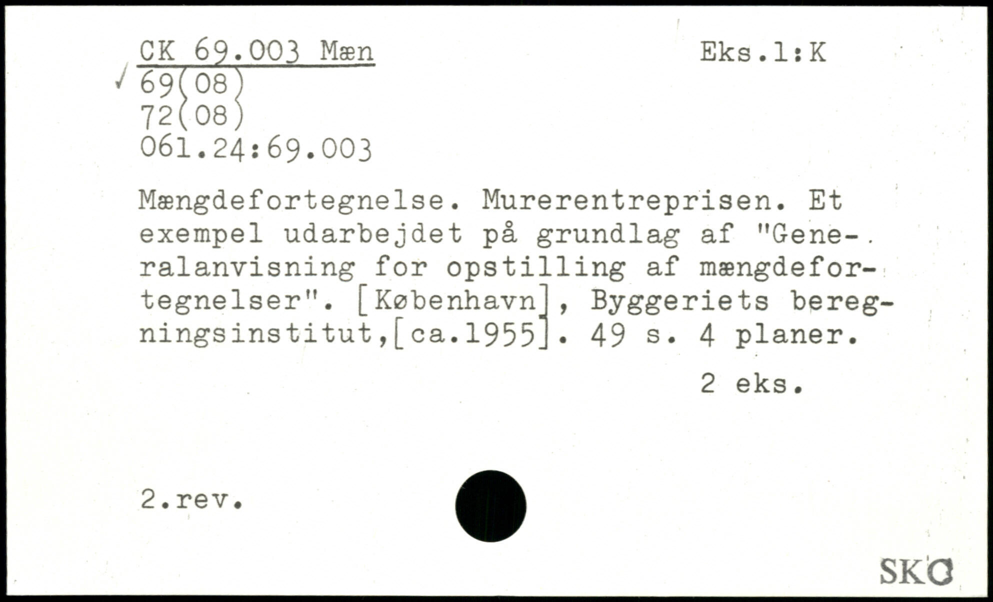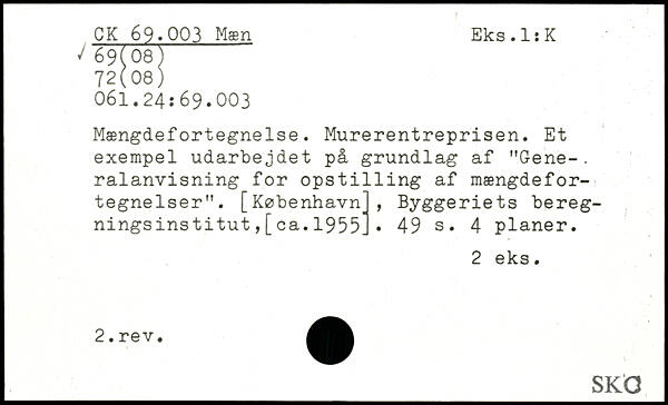 Mængdefortegnelse. Murerentreprisen. Et exempel udarbejdet på grundlag af "Gene-, ralanvisning for opst1111ng af mængdefor-tegnelser". [København^ , Byggeriets beregningsinstitut ,[ca.1955J.