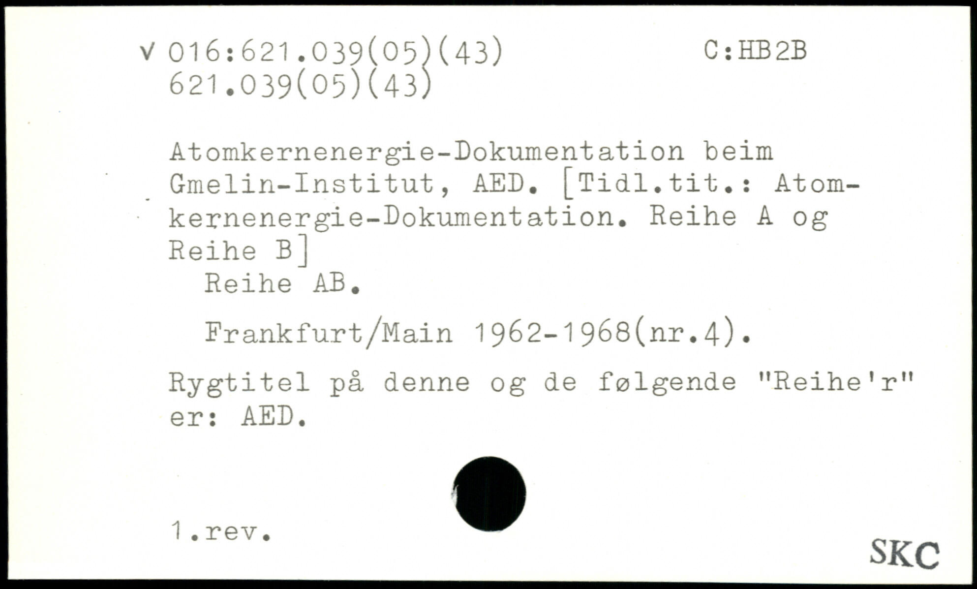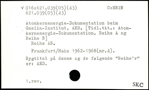 Atomkernenergie-DokumentatIon beim Gmelin-Institut, AED. [Tidl.tit.: Atomkernenergie-Dokument ation. Reihe A og Reihe B] Reihe AB. Frankfurt/Main 1962-1968(nr.4). Rygtitel pä denne og de folgende ”Reihe'r" er: AED.