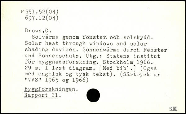 Solvärme genom fönster, och solskydd. Solar heat through Windows and solar shading devices. Sonnenwärme durch Fenster und Sonnenschutz. Utg.: Statens institut för byggnadsforskning.