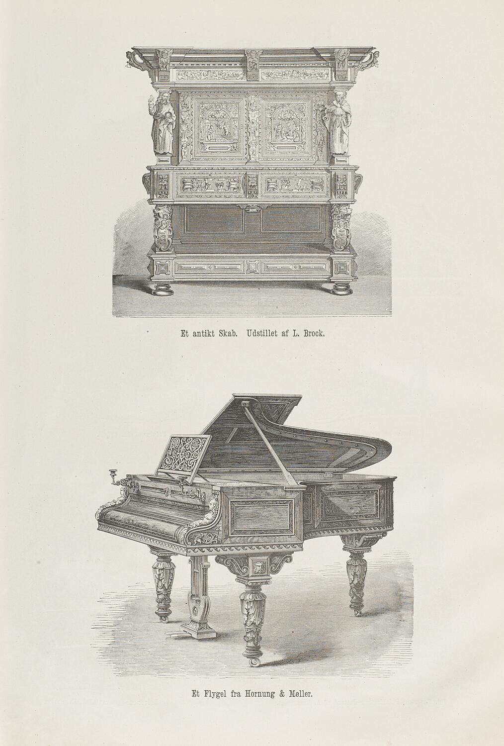 Et antikt Skabt udstillet af L. Borck. Et Flygel fra Hornung & Møller