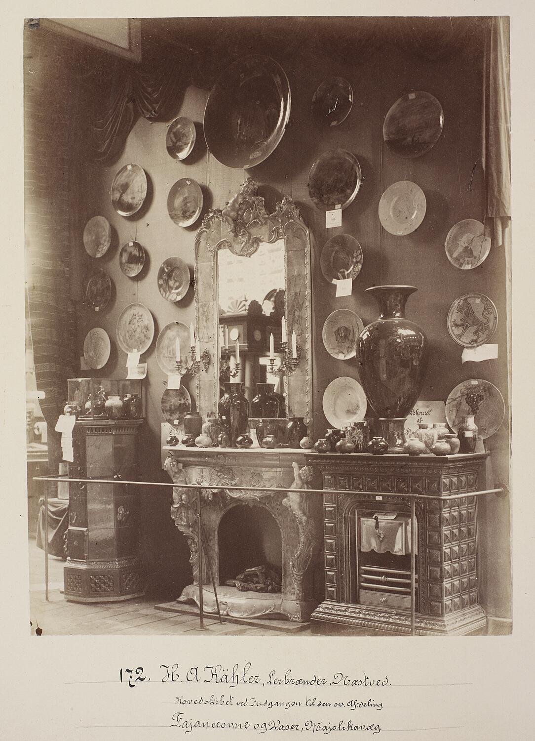 H. A. Kähler, Lerbrænder, Næstved. Hovedskibet ved Indgangen til den svenske Afdeling. Fajanceovne og Vaser, Majolikavæg